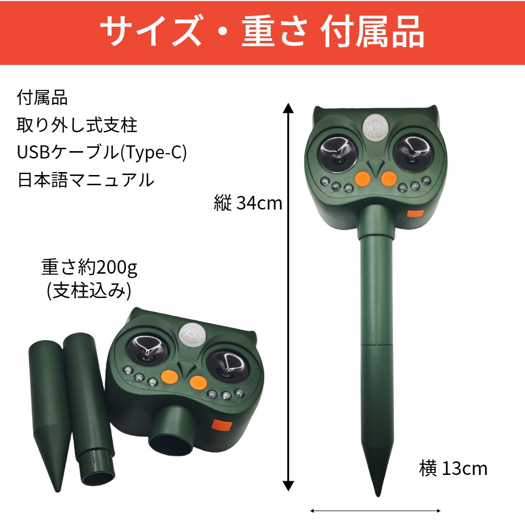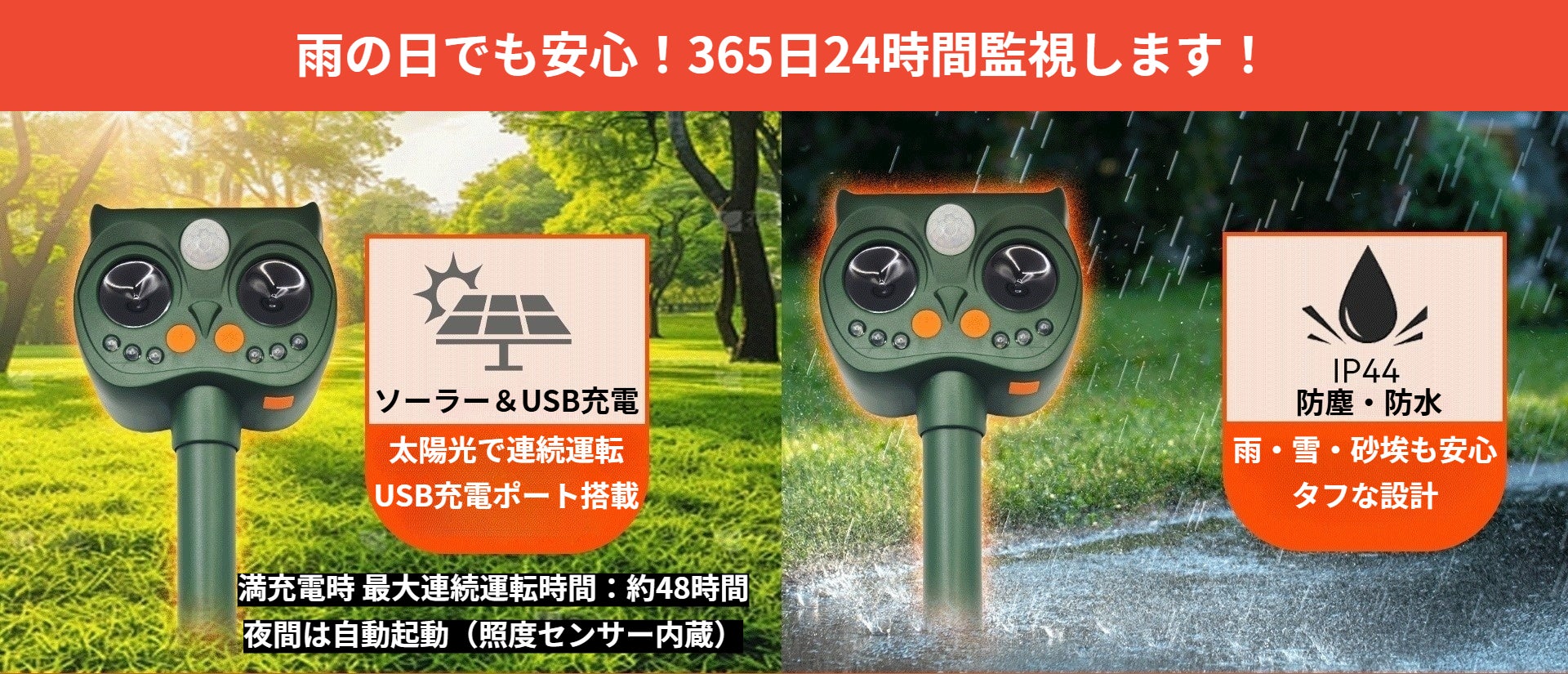 A.はい。動物同様、体温が一定の全ての生き物が感知されます。光と音で威嚇するという意味では一定の効果があると言えます。