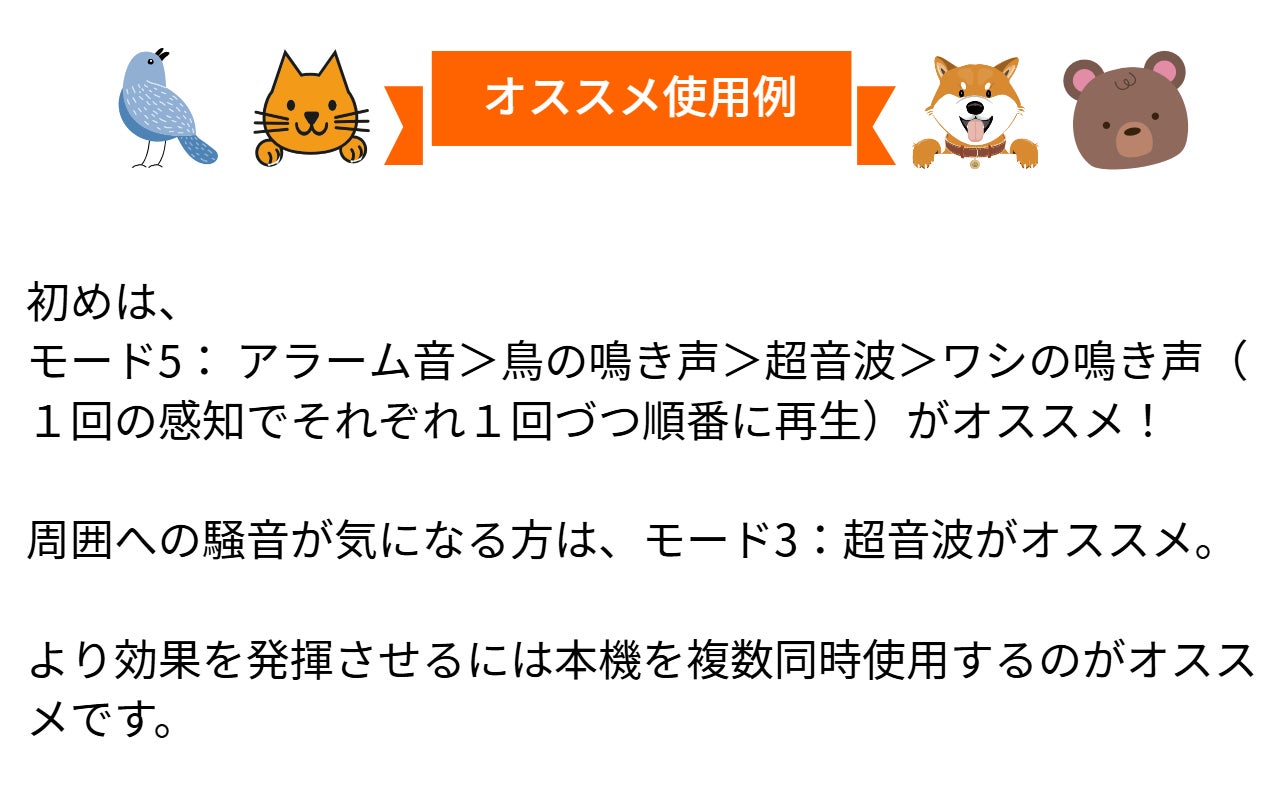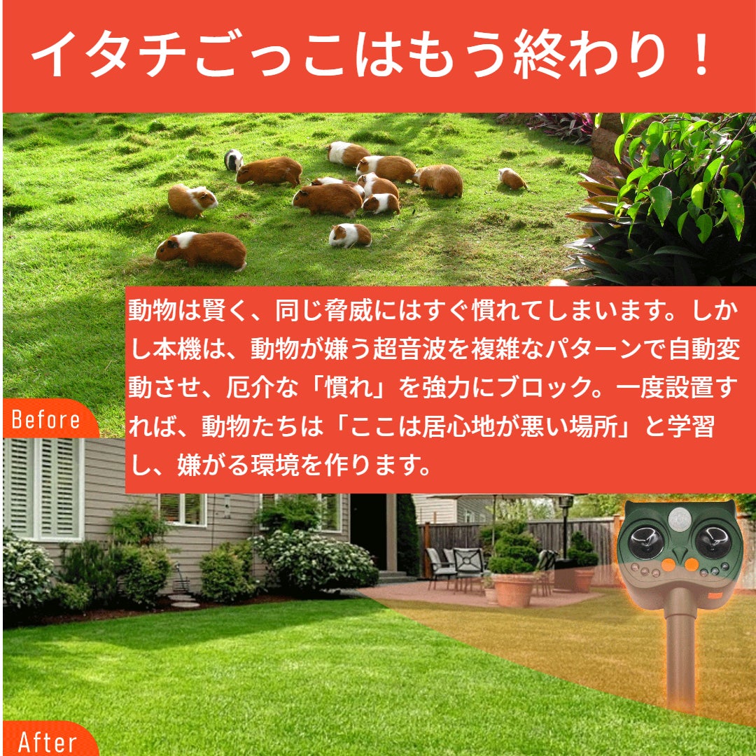 動物たちに優しく、しかし強力に彼らを遠ざけるサポートをします。動物も、あなたも傷つかない。誰もが心地よく暮らすための、スマートな答えです。