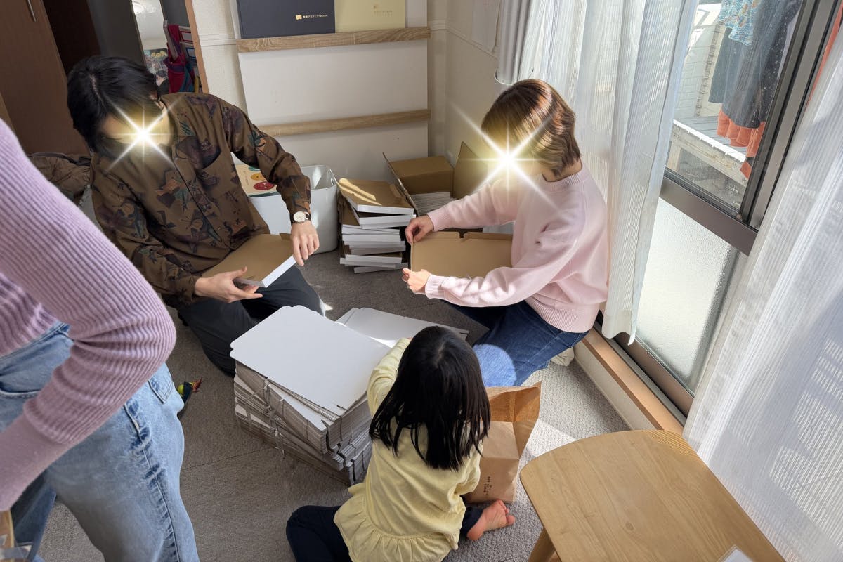 翌日、3月14日の13時からは、クラウドファンディングのリターンで「発送手伝い」を選んでくださった方、また友人合わせて6名の方が集まってくれました。