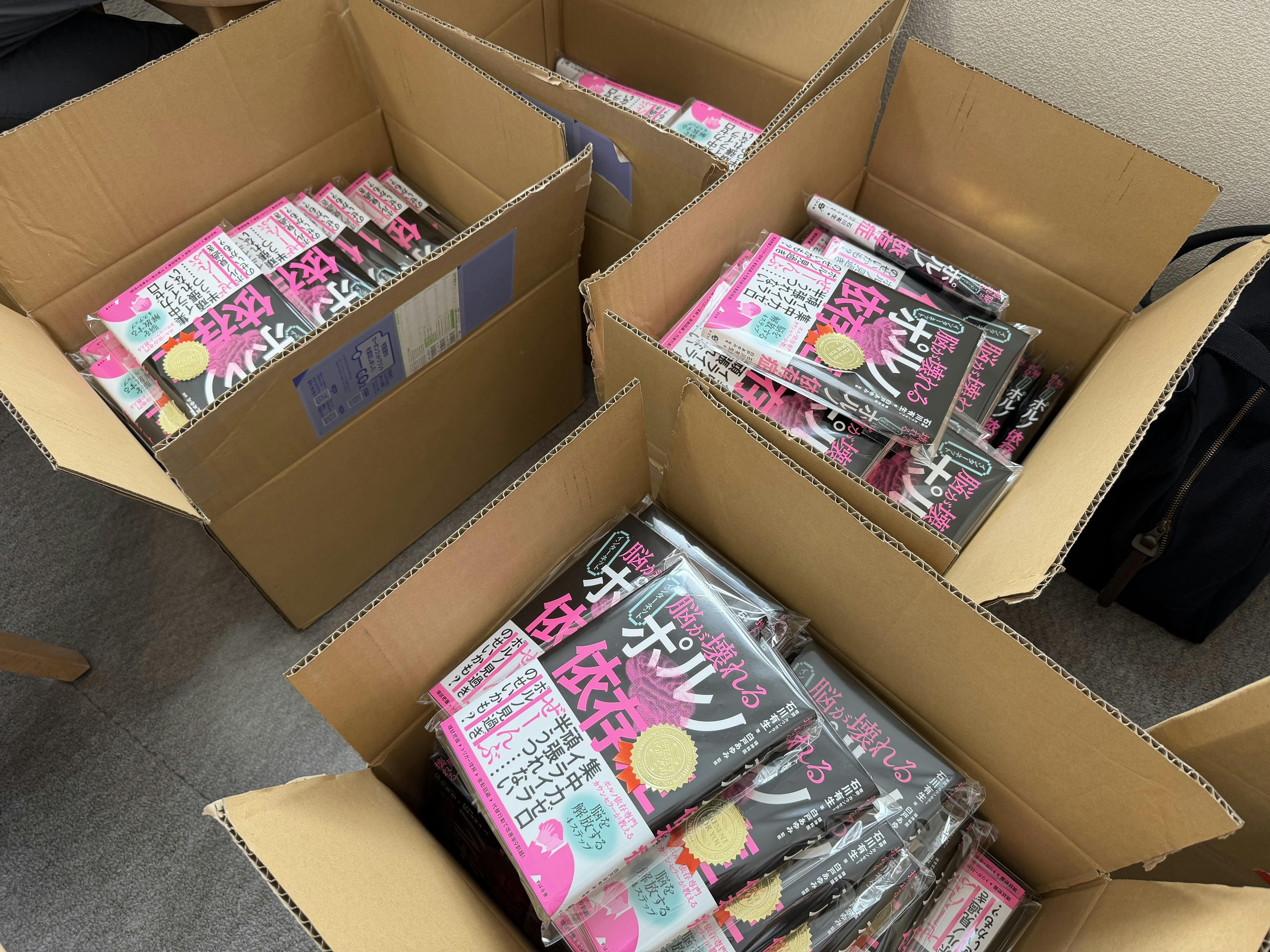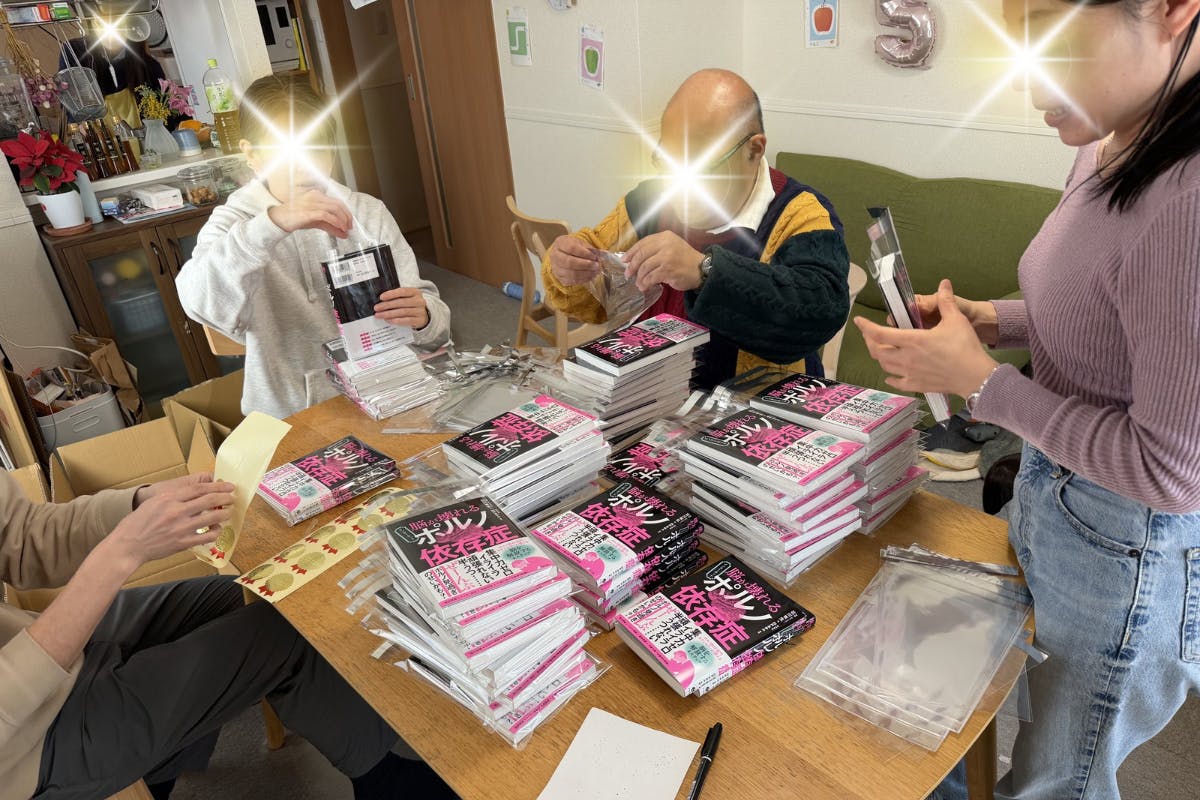 発送の前に、手伝いに来てくれた方には最初の読者となってもらいました。その場で本を読む時間を持ち、ページをめくってもらいました。その後、本の梱包作業、箱の組み立てなどをして、サイン本のリターンがある方の分を準備して発送しました。
