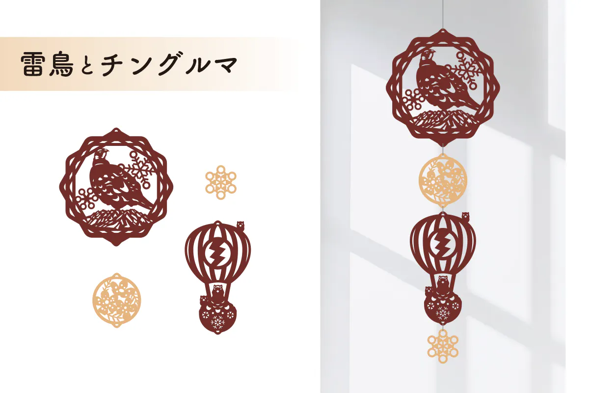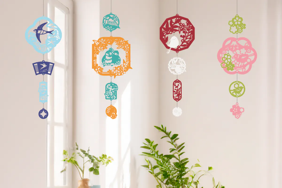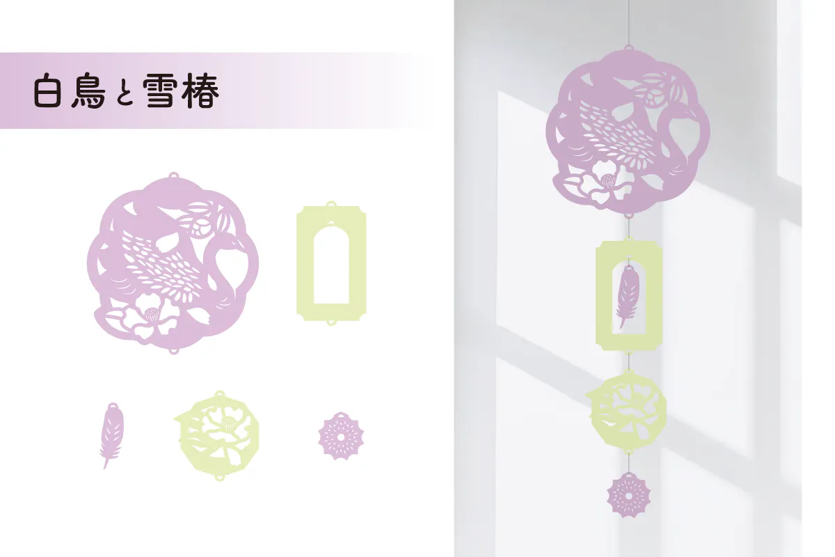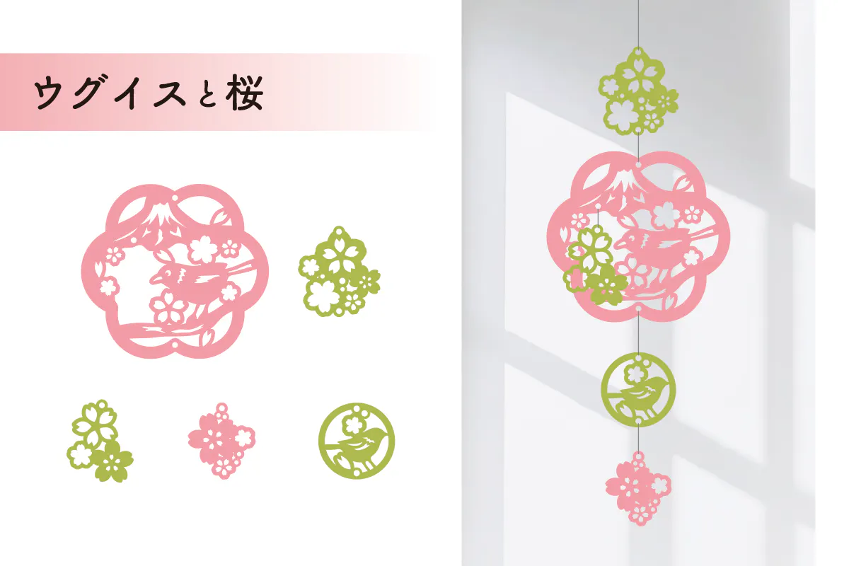 季節の鳥と花を繊細な切り絵で表現した紙製のモビールです。