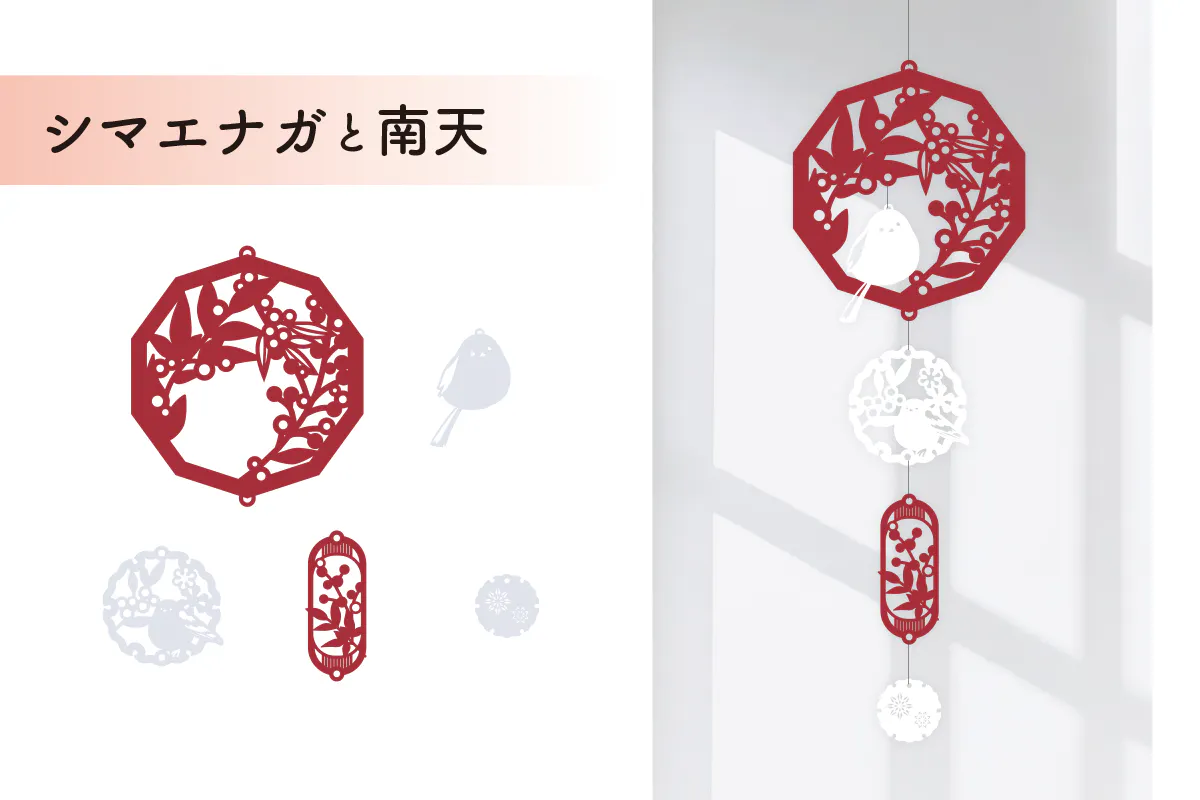 ぽってりとしたシマエナガが南天の枝にちょこんと止まった、愛くるしいデザイン。