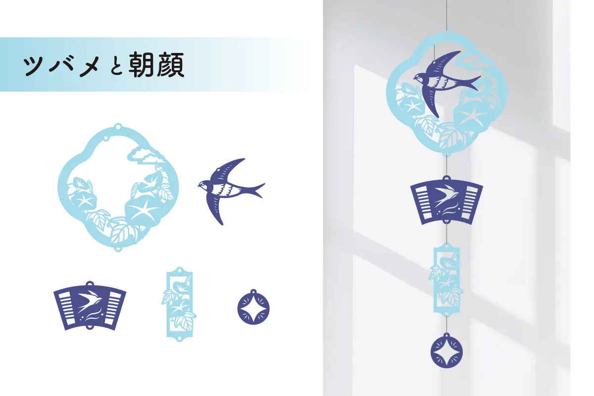 夏の空を舞うツバメと、朝顔の涼しげな花が爽やかな風を感じさせるデザイン。
