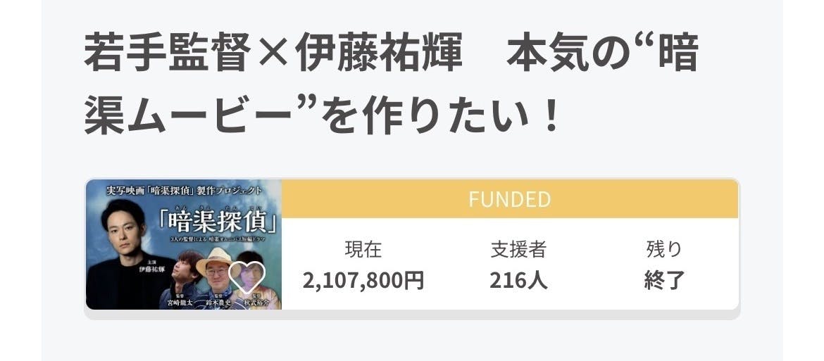 2026/03/01 01:14いつも短篇オムニバス映画『暗渠探偵』を気にかけてくださっている皆様、本当にありがとうございます。2026年2月28日23:59にクラウドファンディングを終了しのべ216名の方より¥2,107,800のご支援をいただきました(CAMPFIRE内の総計)ありがとうございました。既に第1話『けんけんぱ』(鈴木農史監督)は撮影を終了しており、編集などの仕上げ作業を開始しております。今後は秋武組、宮崎組の撮影と続きます。集まった支援金につきましては、収支を明らかにし、公開して参ります。リターンでもあります完成記念上映会を皮切りに地方巡業、各種リターンなどの情報を随時お伝えいたします。今後も『暗渠探偵プロジェクト』への応援、拡散などどうぞよろしくお願いします。取り急ぎではありますが、クラウドファンディングへのご支援の御礼まで。(宮崎龍太) もっと見る最新キャスト情報!!