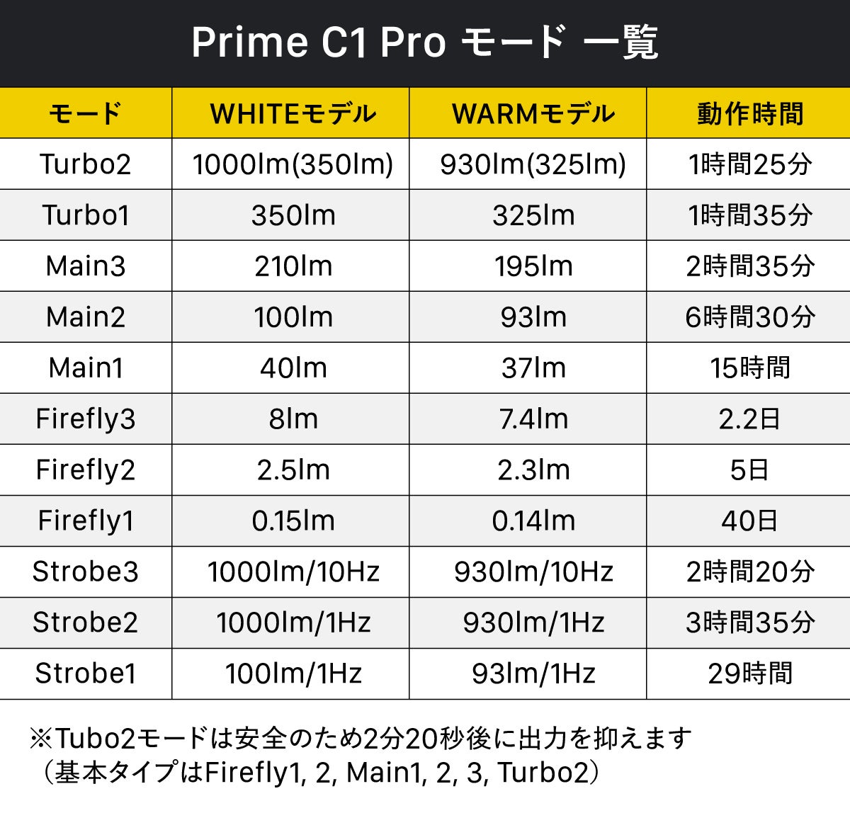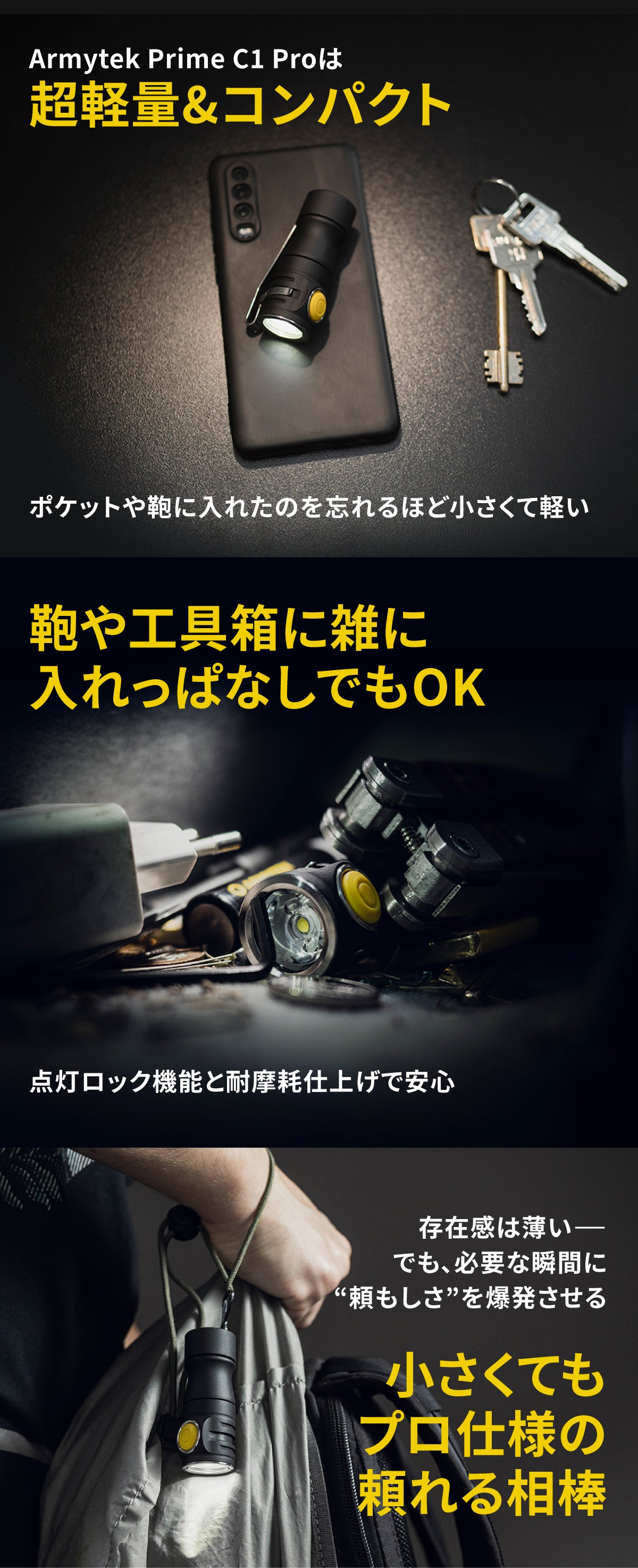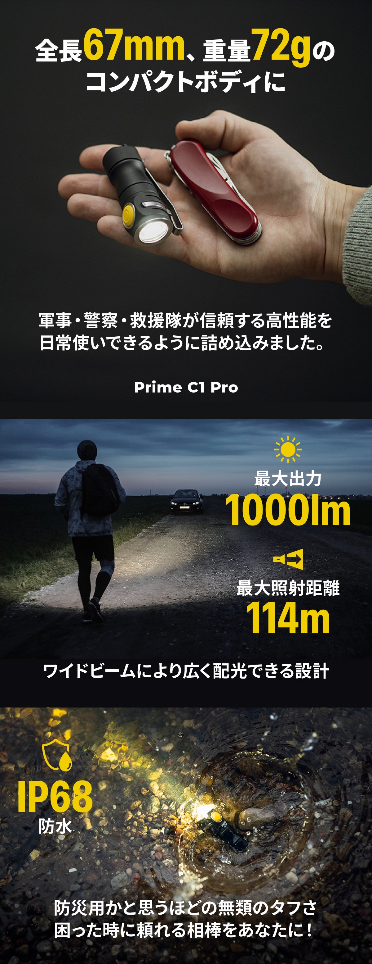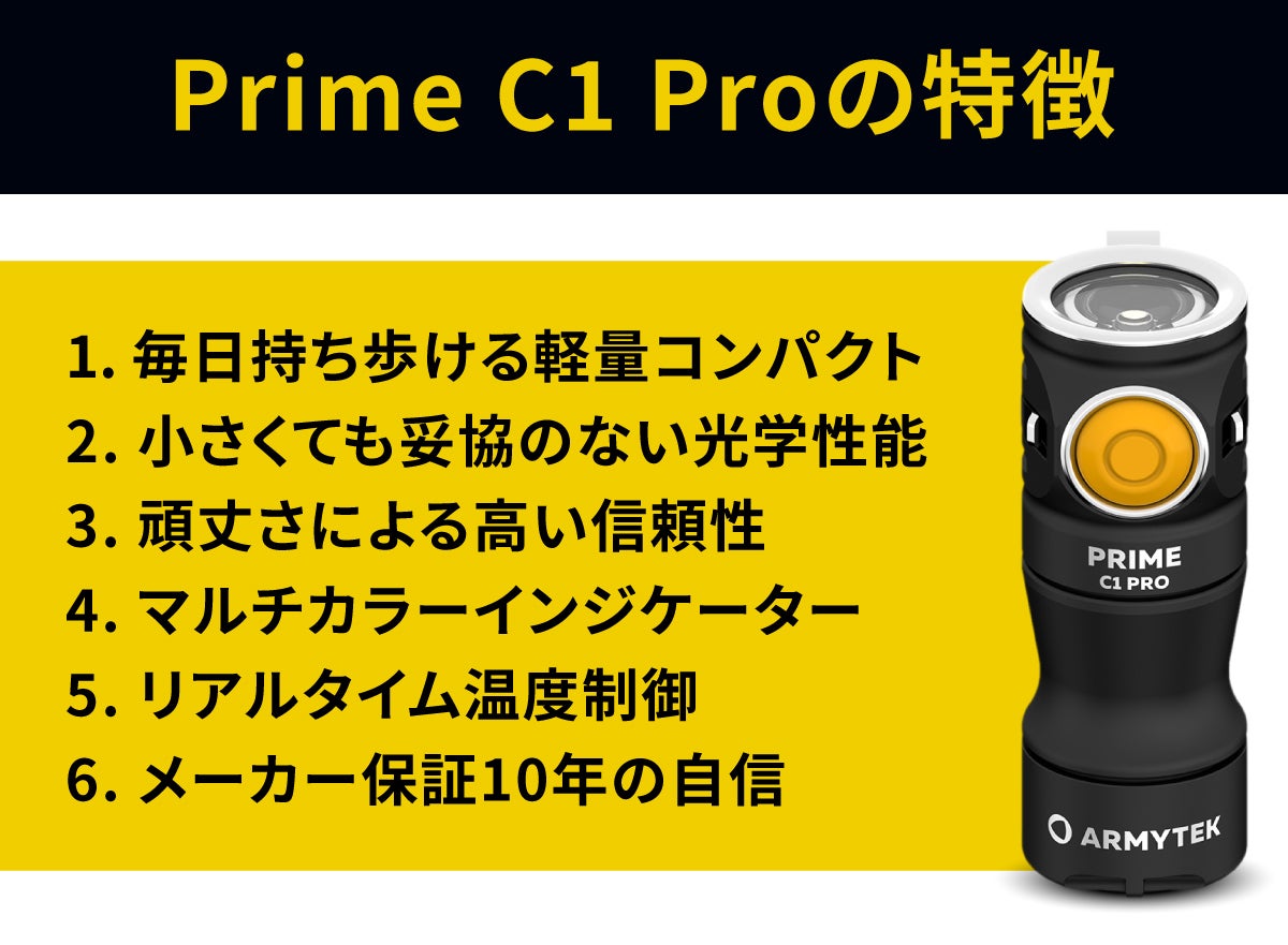 A: Prime C1 Proは、軍事・警察レベルの性能をコンパクトサイズに凝縮した点が最大の違いです。明るさ安定化、IP68完全防水、10m落下耐性、10年保証など、プロ仕様の機能を備えています。
