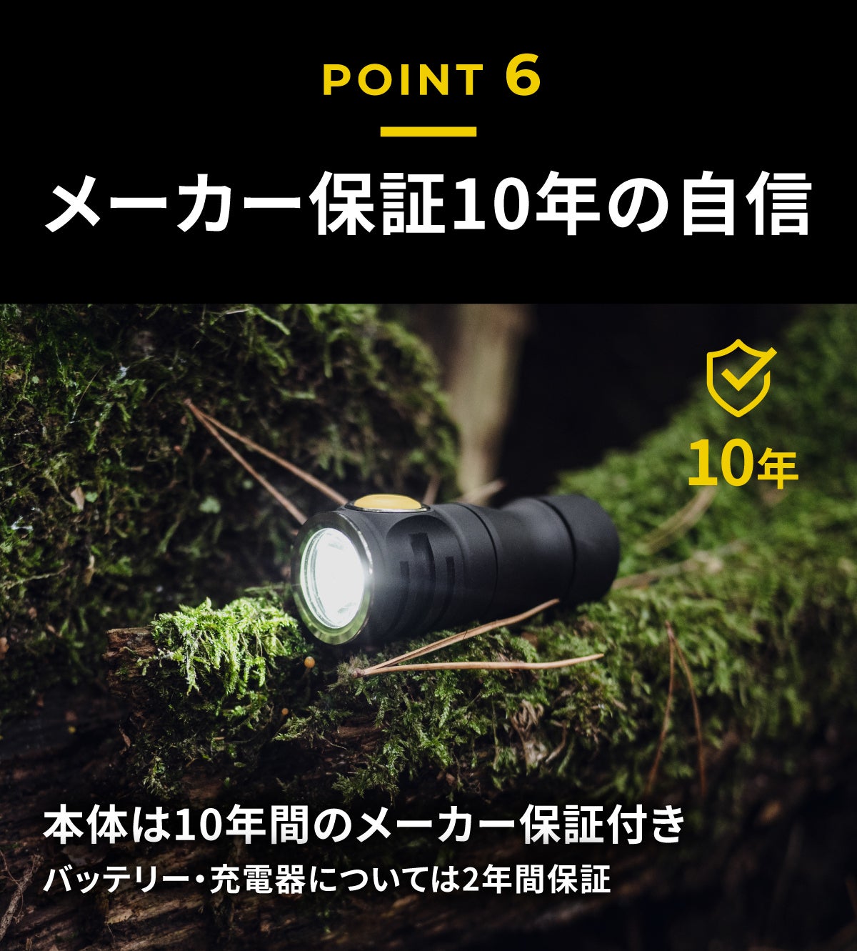耐久性は設計思想の中核です。多くのライトは10階相当の落下や50mの水中にも耐えうる余裕を持って設計。「10年無償保証」を掲げ、妥協のない品質を目指しています。