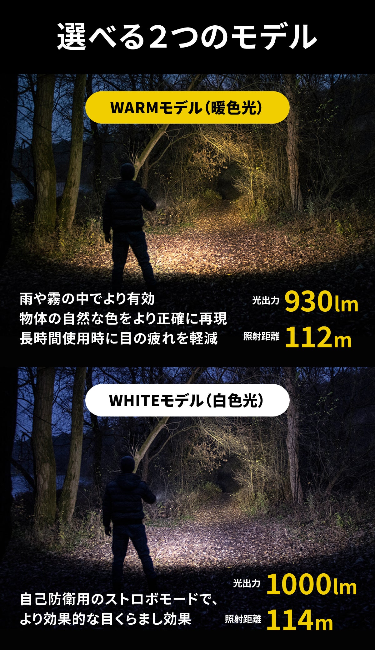 A: 一般的な白色LEDよりも黄色味を帯びた、温かみのある光です(約3000K)。目に優しく、長時間使用でも疲れにくい特徴があります。また、暖色光は霧や煙の中での視認性が高く、アウトドアや作業現場で有利です。