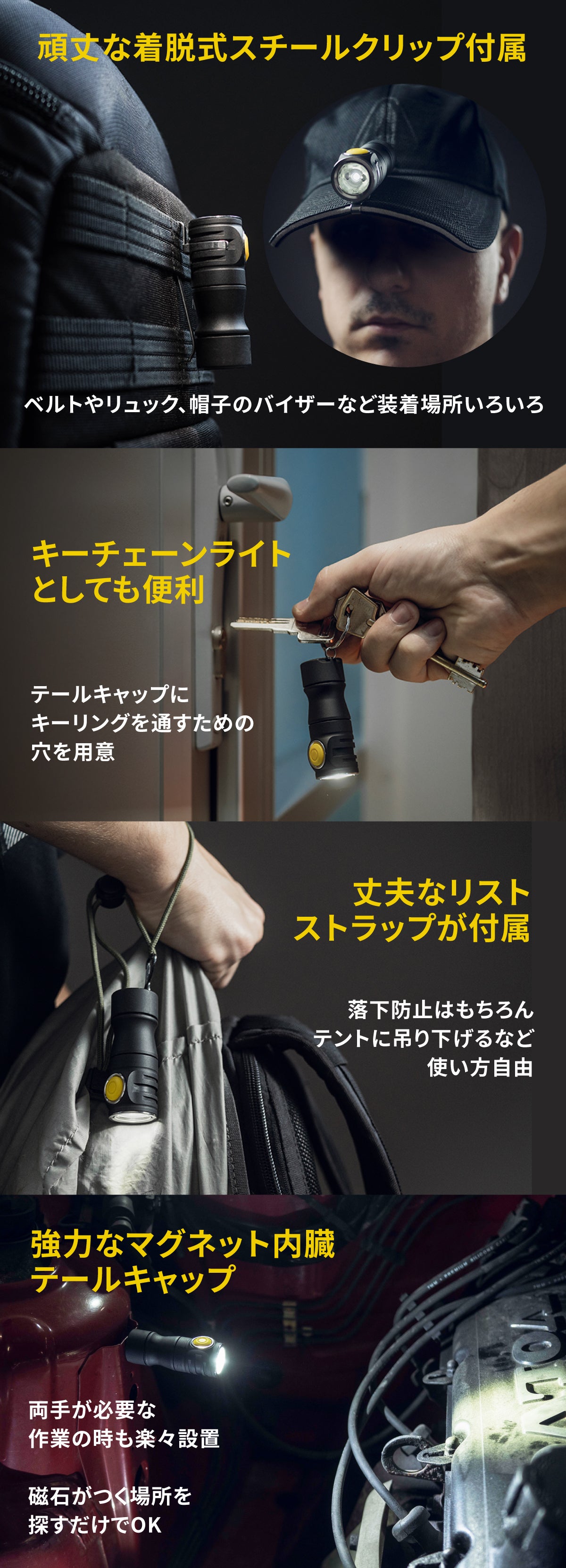 A: はい。テールキャップには強力なネオジム磁石が内蔵されており、垂直な金属面でもしっかり固定できます。車のボンネット、工具箱、配電盤など、様々な場所で使用できます。