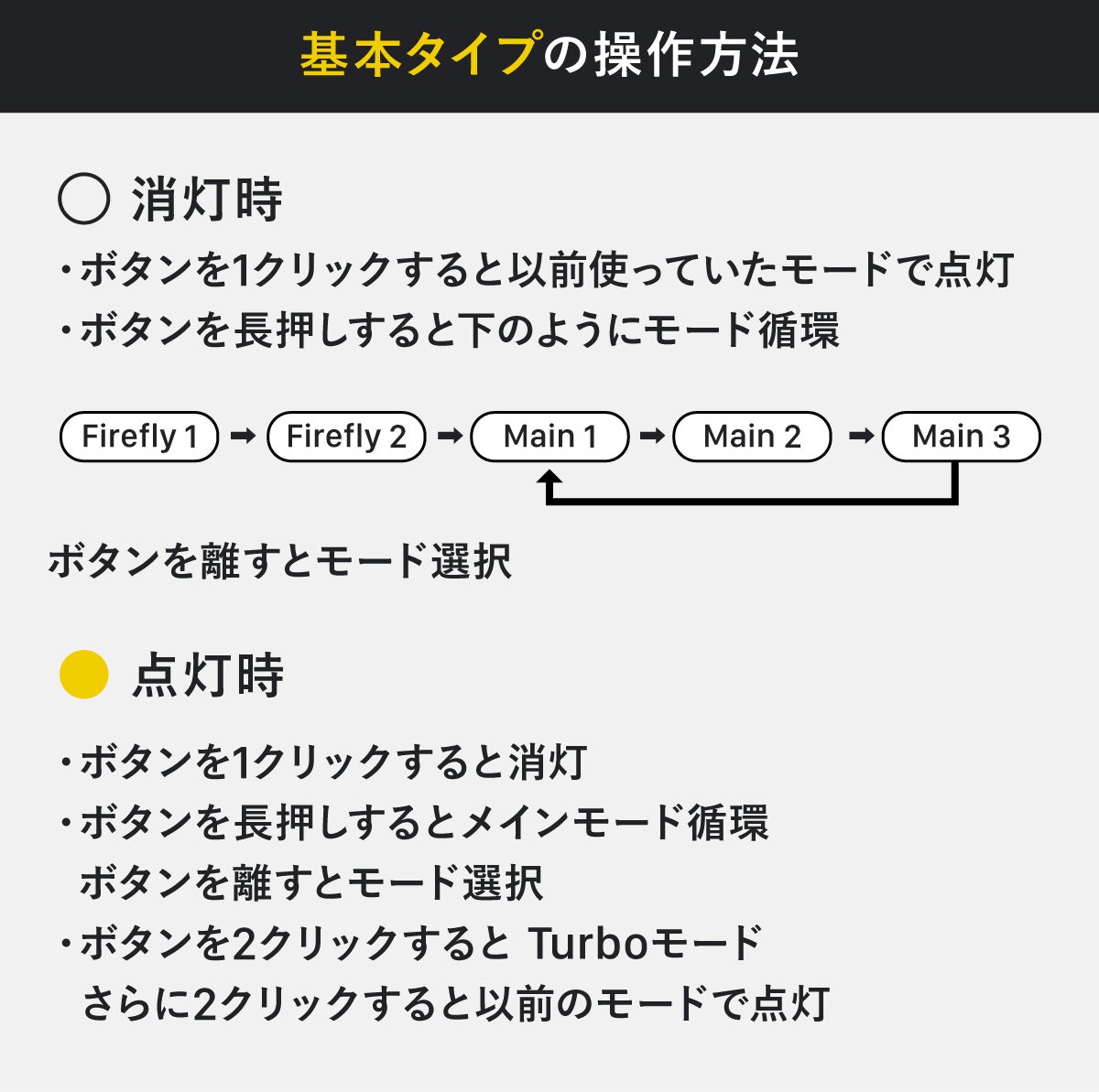 サイドボタンを押すと前回選択しておいたモードで点灯します。