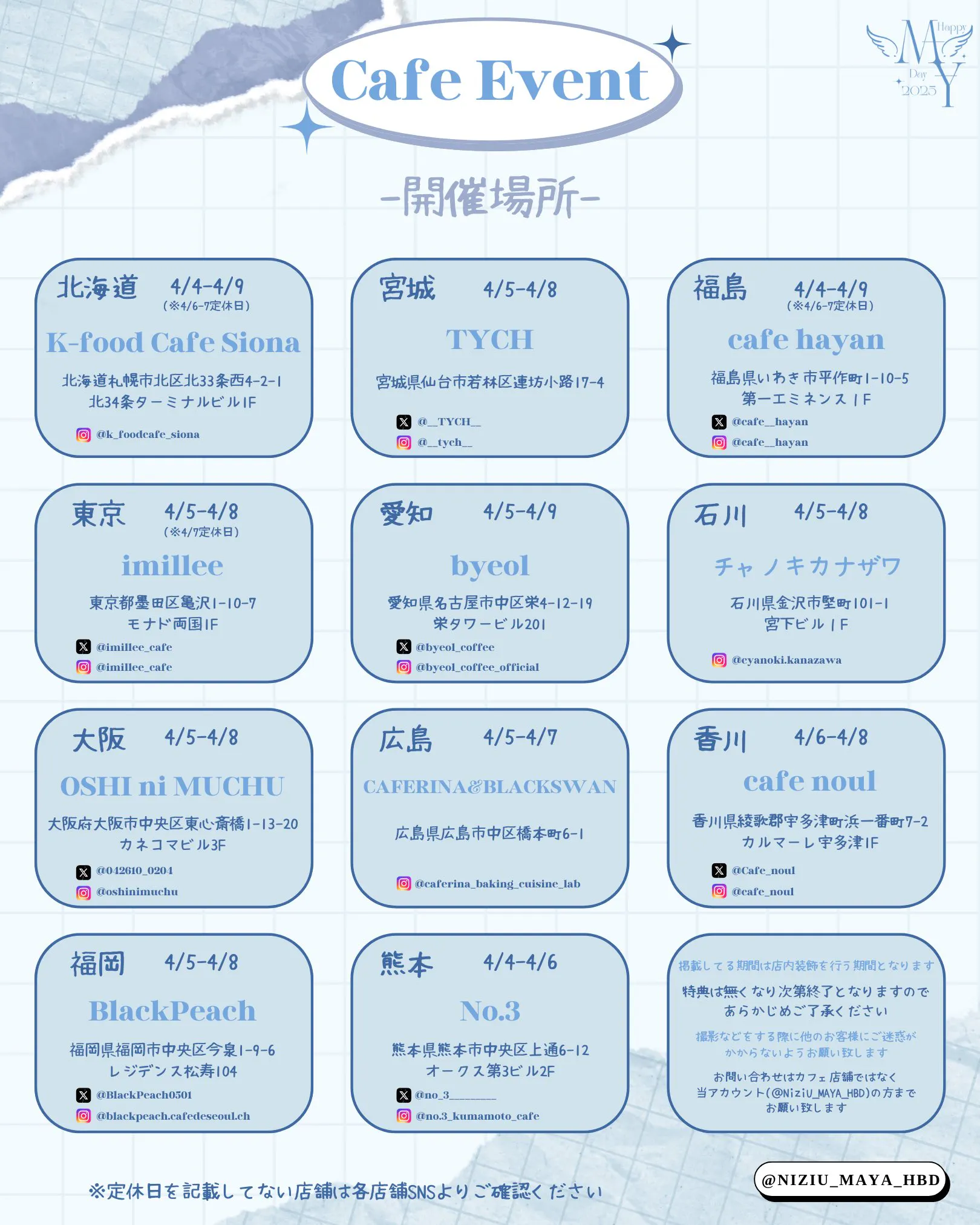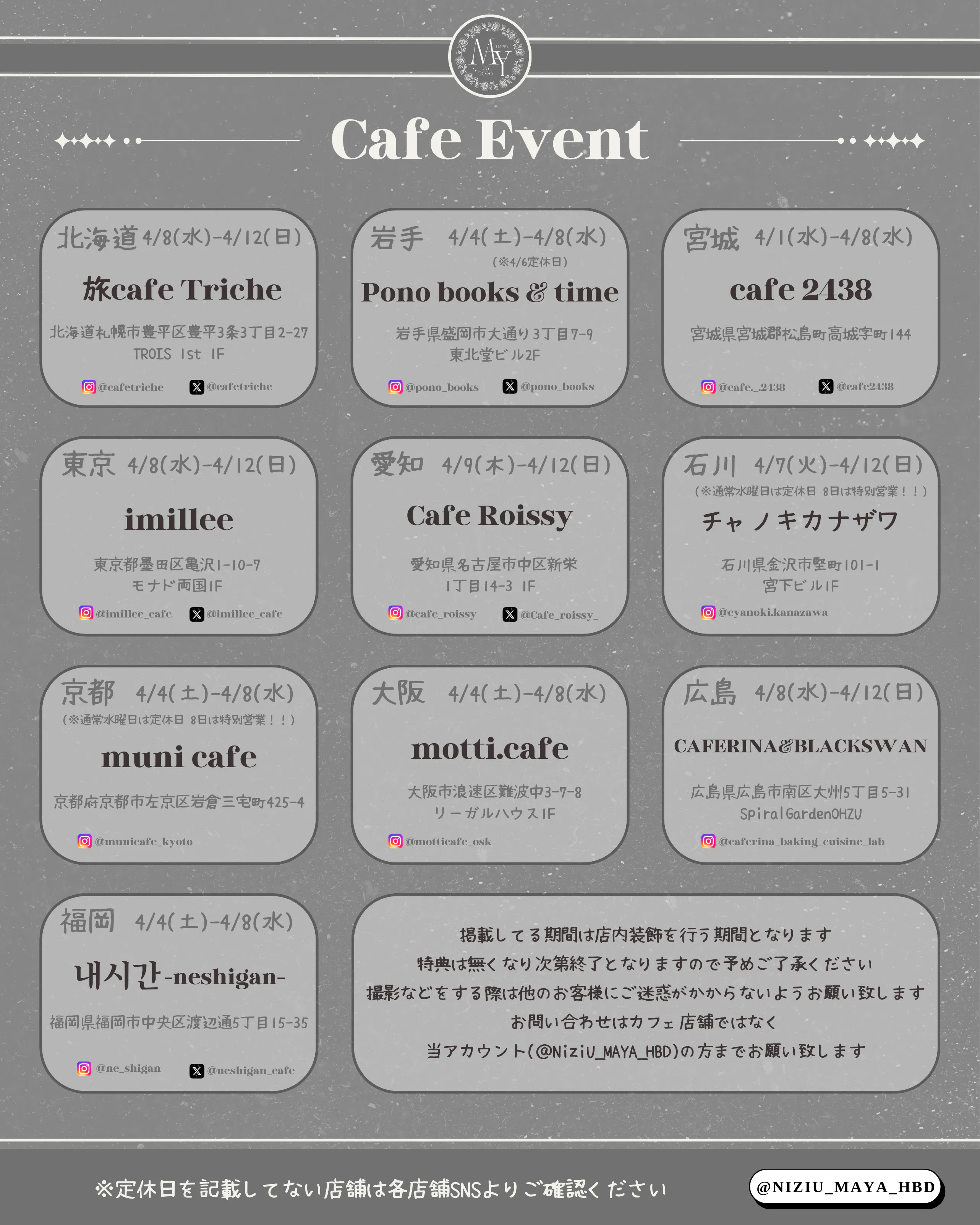 2026/03/31 21:00支援者の皆様本年度は全国10ヵ所でセンイルカフェイベントを開催します。明日4/1(水)より宮城県でスタートします。お近くの方は是非お立ち寄りくださいませ。各店舗の開催期間が異なるためご注意ください。各店舗によってノベルティを配布する注文条件が異なりますので、各自ご確認をお願いいたします。各店舗の情報は、X(旧Twitter)@NiziU_MAYA_HBD にて更新していきますのでぜひフォローよろしくお願いいたします。 もっと見るお誕生日広告掲載地域・掲載期間のお知らせ