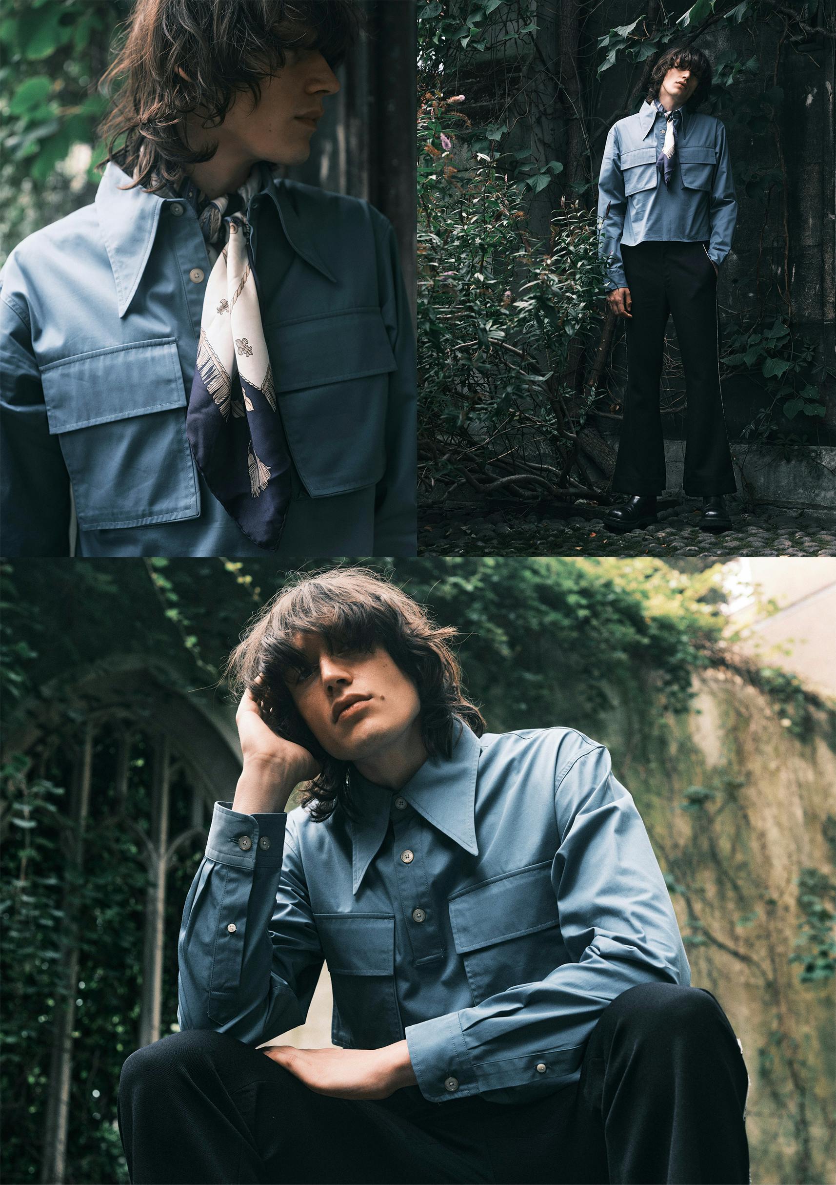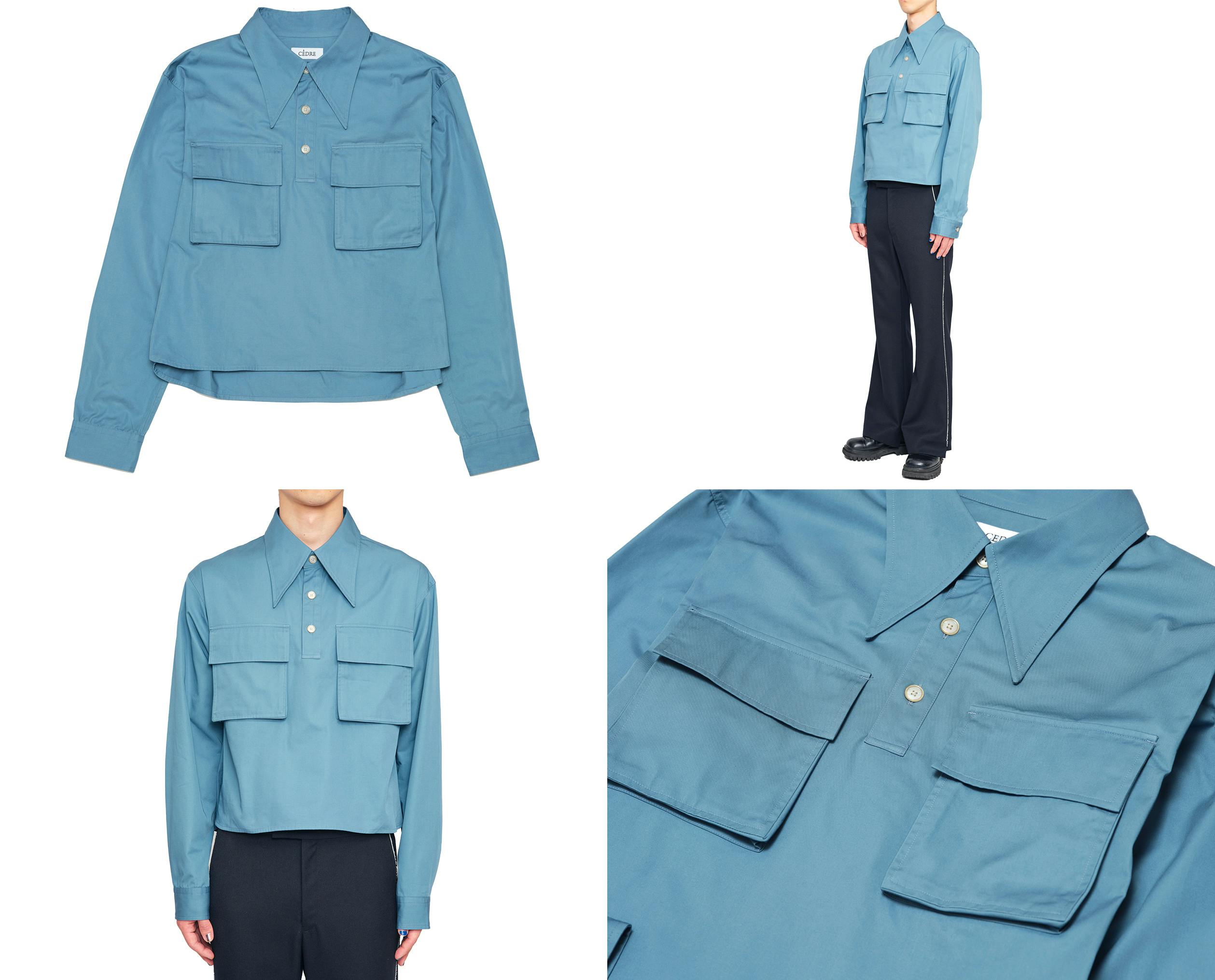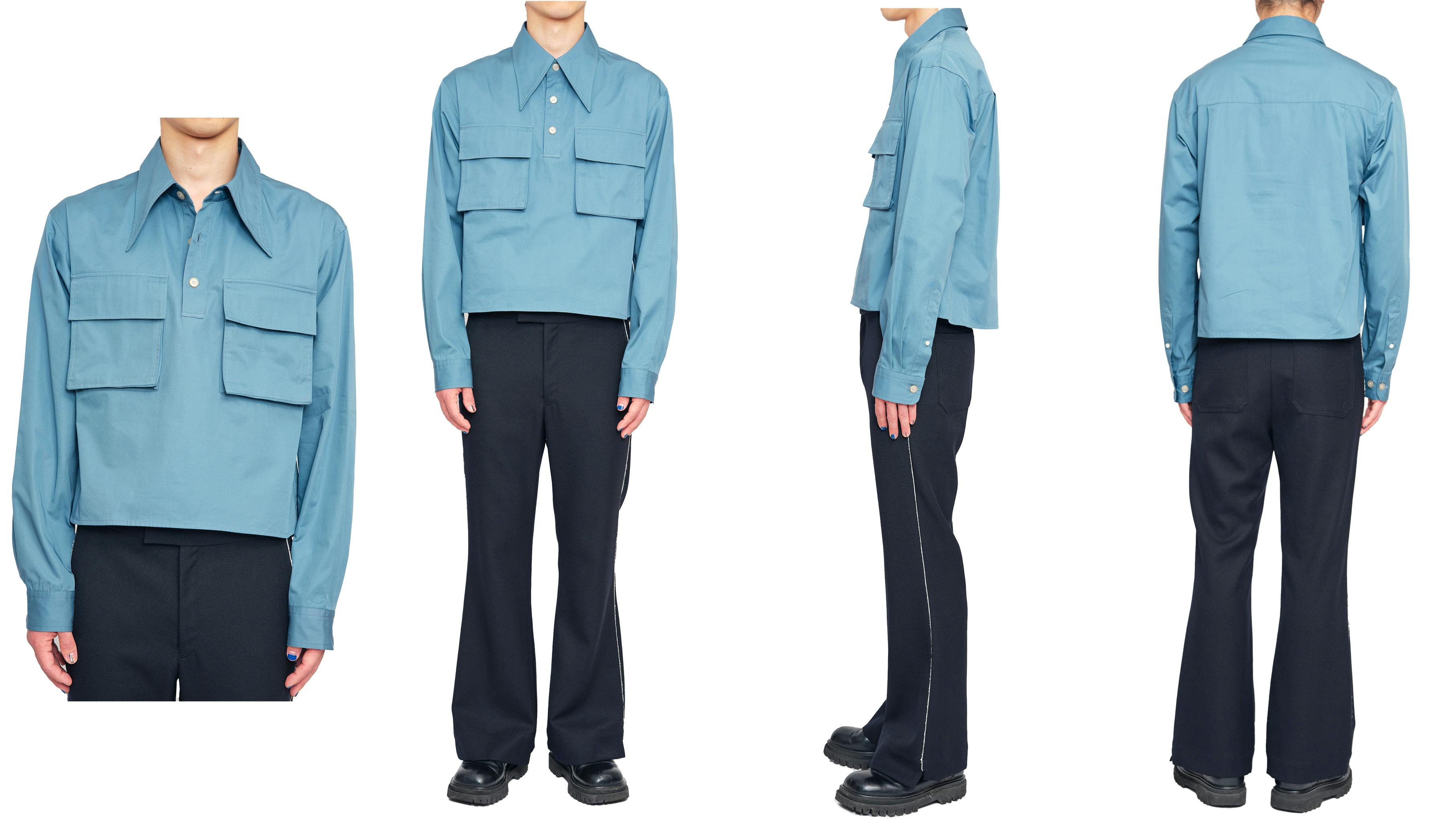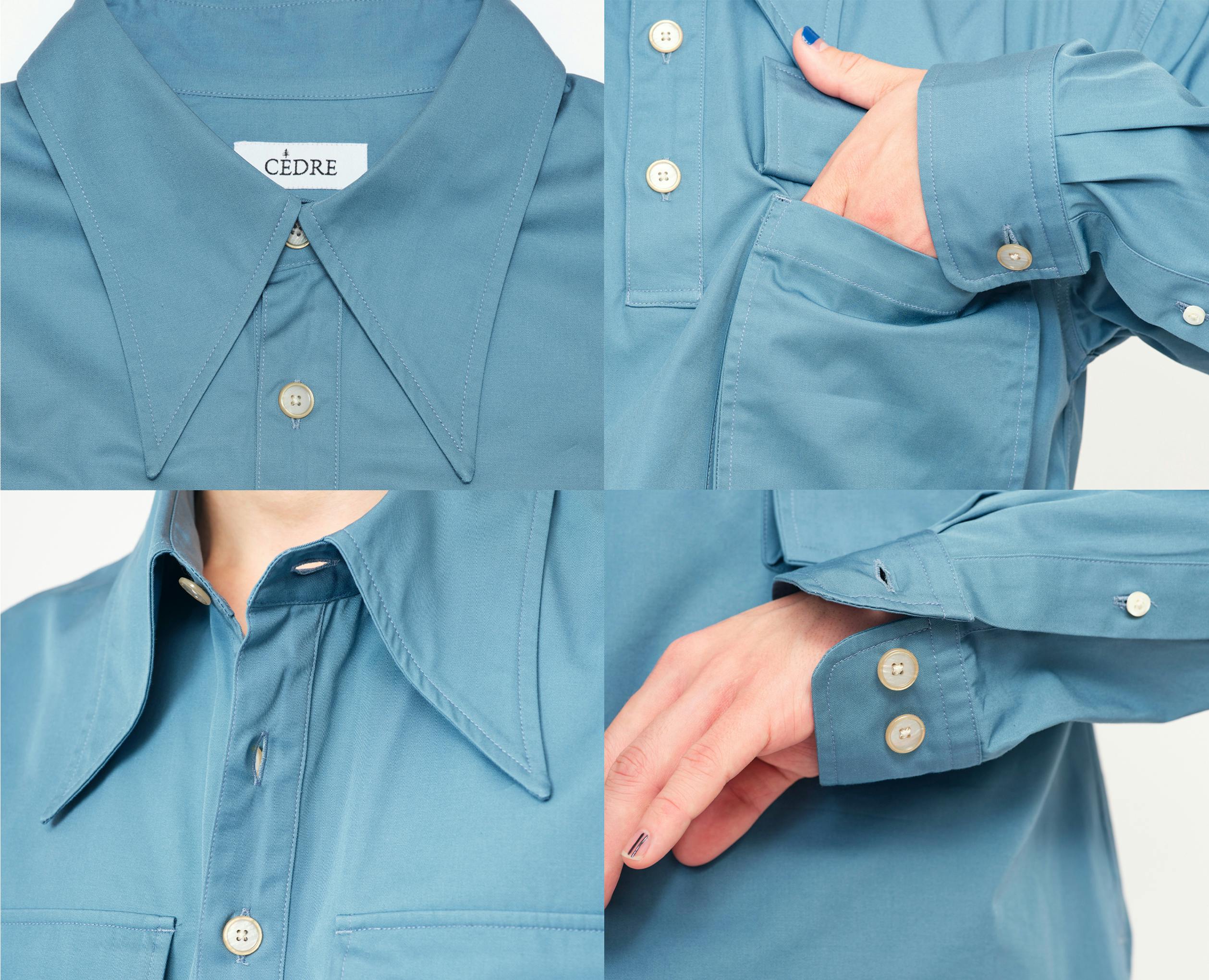 印象的な大きめのカラーが特徴のスリムフィットシャツ。ダブルポケットと胸元のハーフオープンデザインが、存在感のあるスタイルを演出します。やや短めの着丈で、パンツとのバランスが取りやすい設計になっています。シンプルながらも構築的なデザインで、スタイリングの主役になる一着です。
