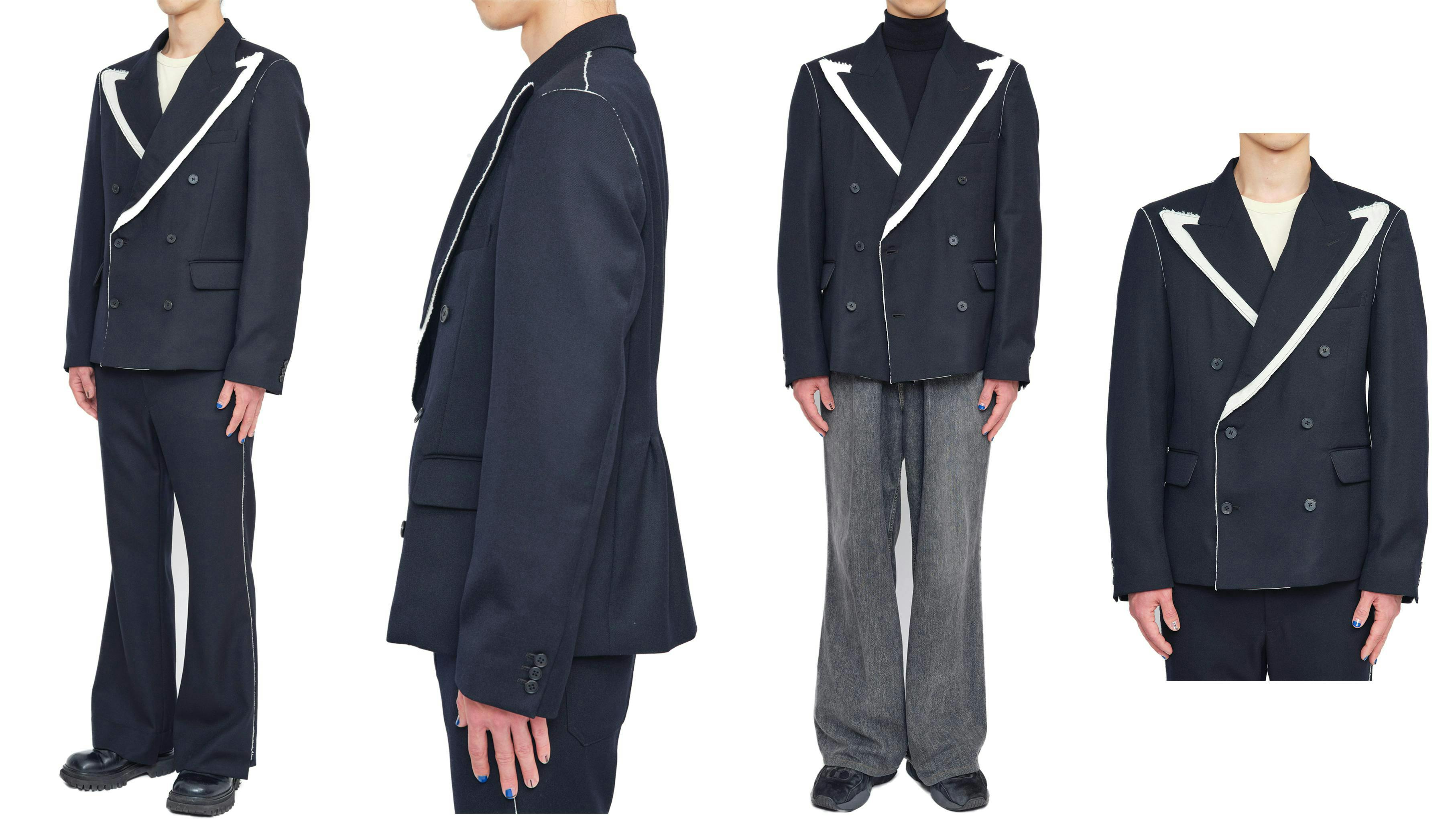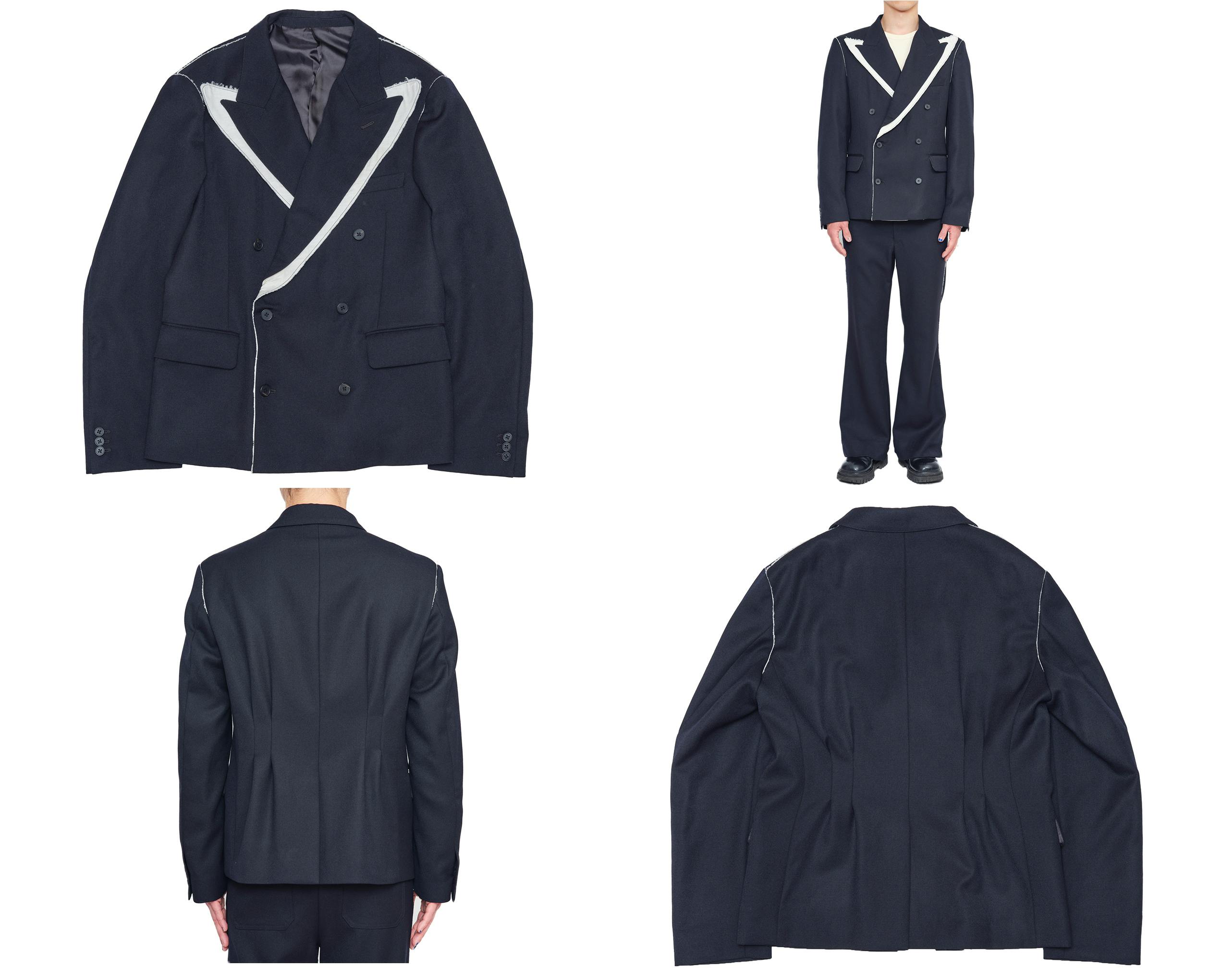 上質なウールギャバジンを使用した、ラグジュアリーな印象のダブルジャケット。重厚感のある生地と二重ラペルのデザインが特徴です。バックダーツによる立体的なシルエットで、ウエストまわりをすっきりと見せるコンパクトなテーラードフィット。やや短めの着丈に仕立てており、スタイリングに幅を持たせています。同素材のフレアトラウザーズとセットアップでの着用もおすすめです。