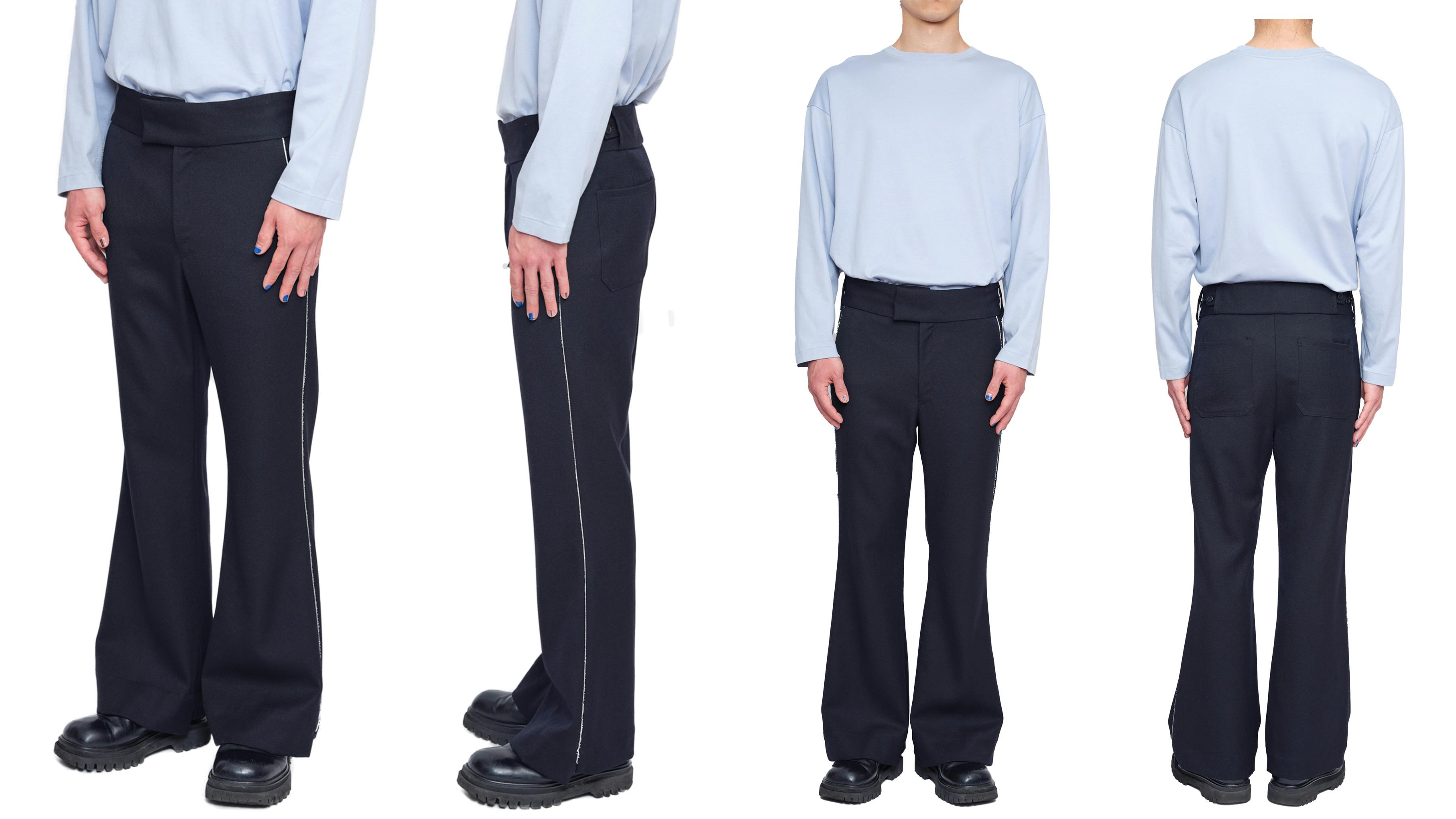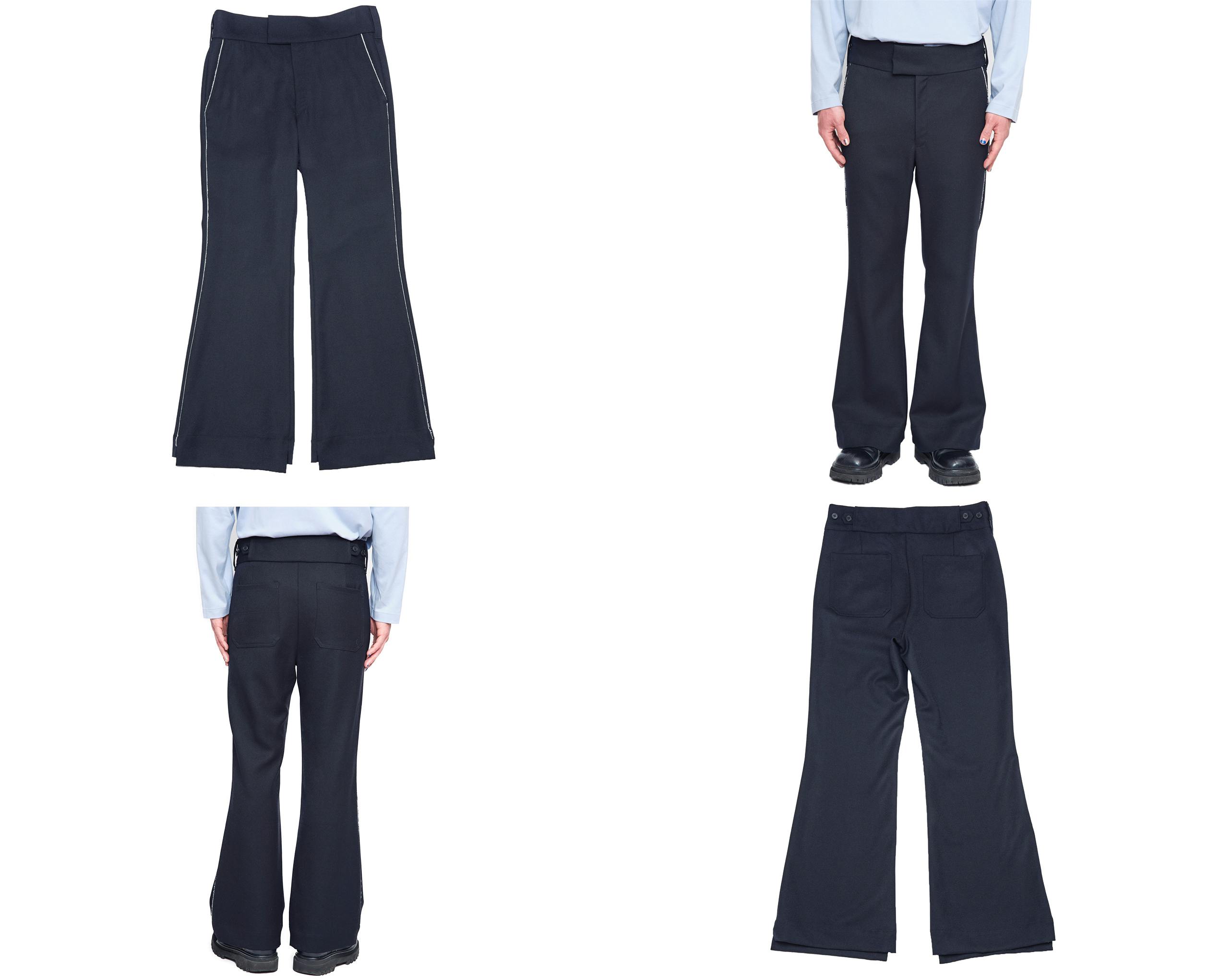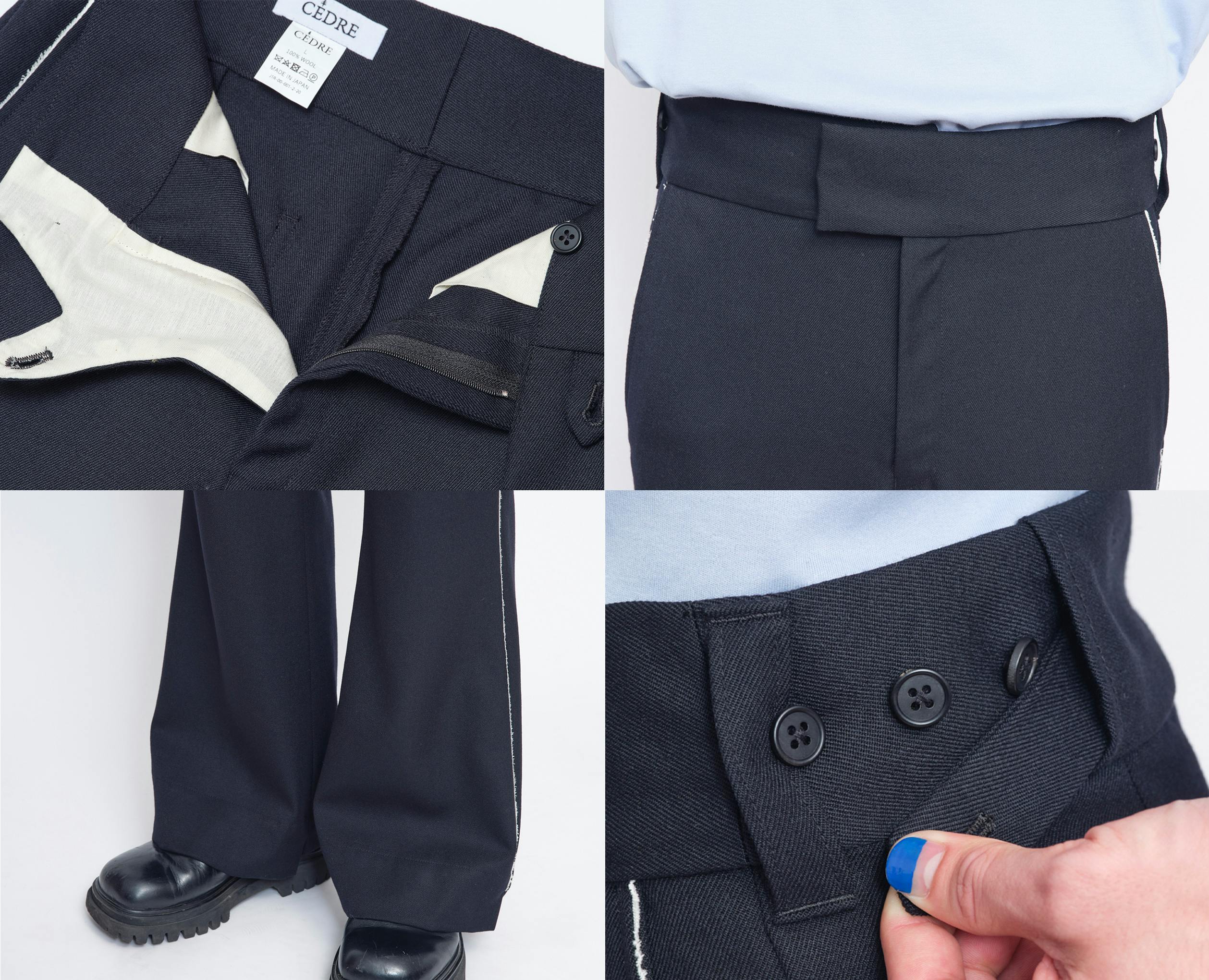 リラックス感のあるフレアシルエットのトラウザー。裾に向かって美しく広がるボリュームのあるラインが、脚のラインを上品に引き立てます。ウエストは最大約4cmまで調整可能で、快適なフィット感を実現。同素材のジャケットと同様に、スラブ調の生地とサイドストライプを採用し、モダンな印象に仕上げています。ダブルブレストジャケットとのセットアップ着用もおすすめです。