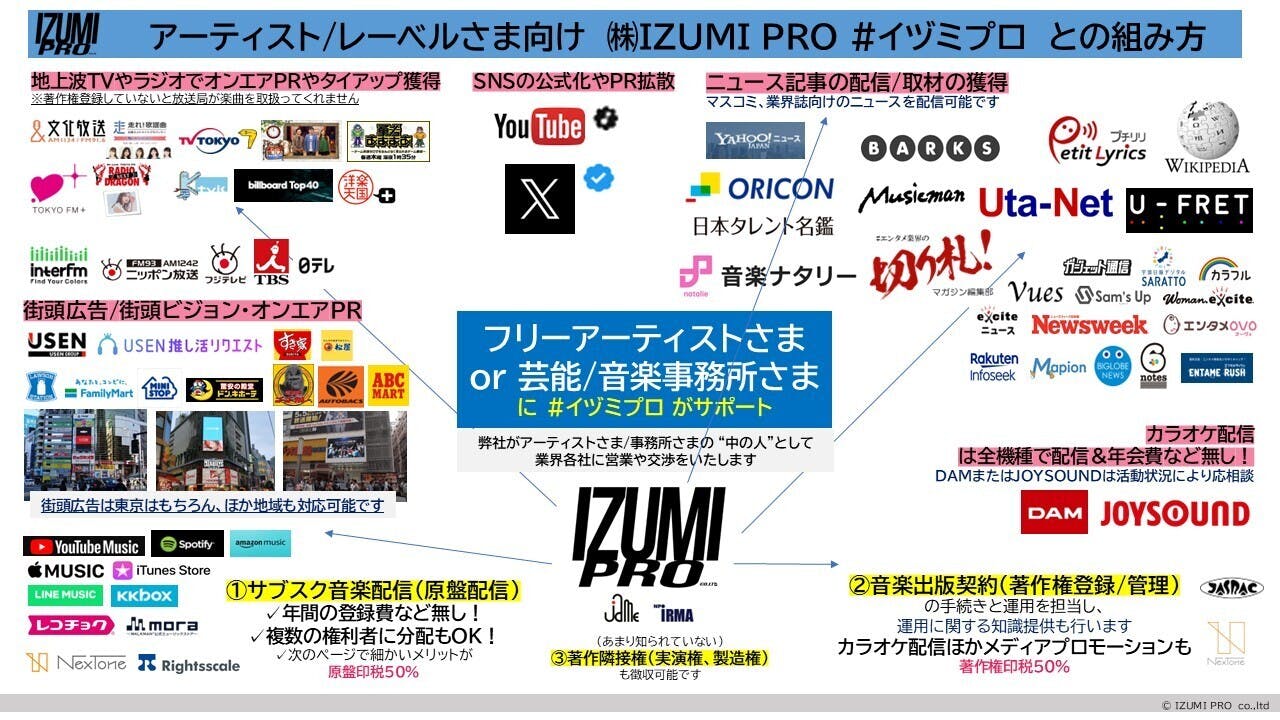 「音楽著作権や音楽配信について」はもちろん。「Xの青バッジの付与」や「YouTubeの公式化」など、実は知られているようでマニアックな知識を#イヅミプロと打ち合わせや提携を行うことでサポートしています