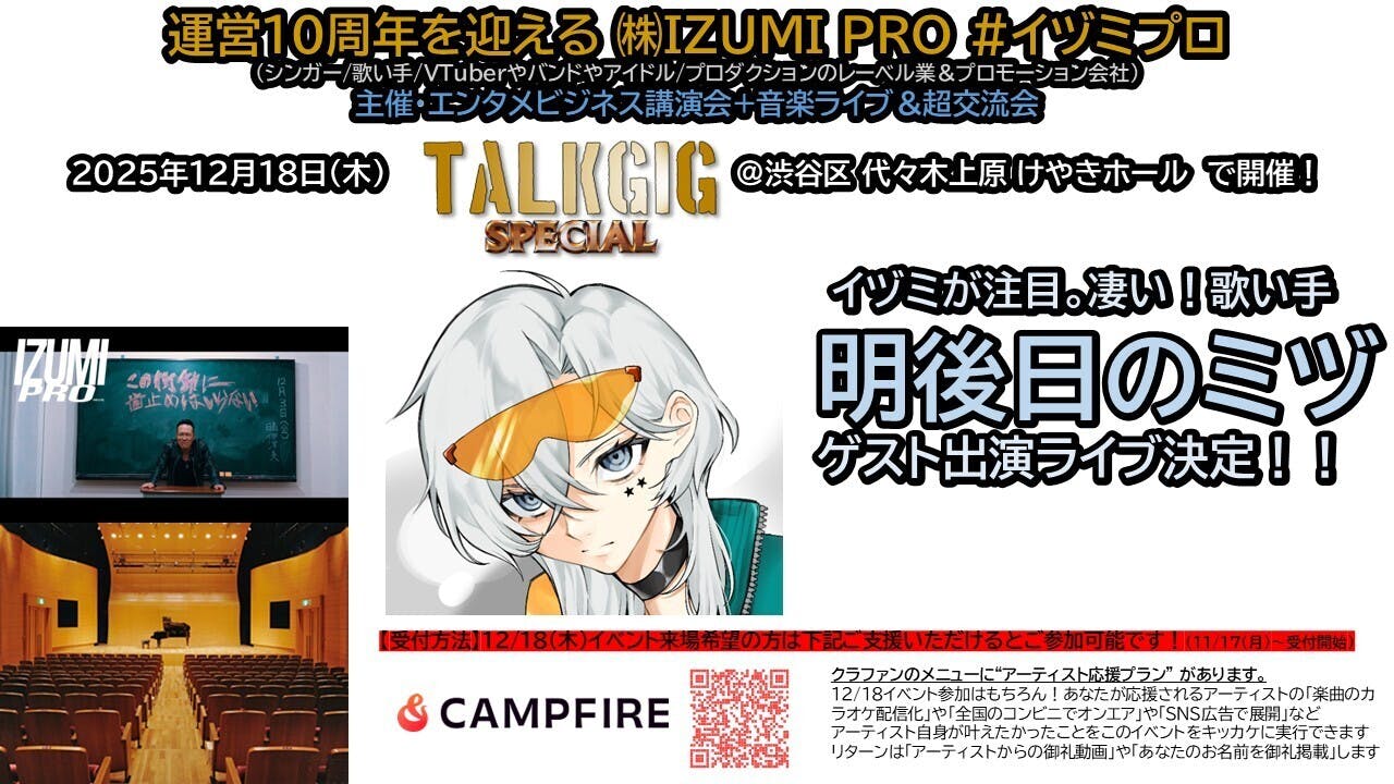 •来場者予定は、20代~40代の歌手、作詞作曲家、編曲家、デザイナー/イラストレーター、ウェブプログラマー、芸能/音楽業界の裏方、伊津美 敬を応援してくれるファン/支援者の方、#イヅミプロ関係アーティストのファンの方々