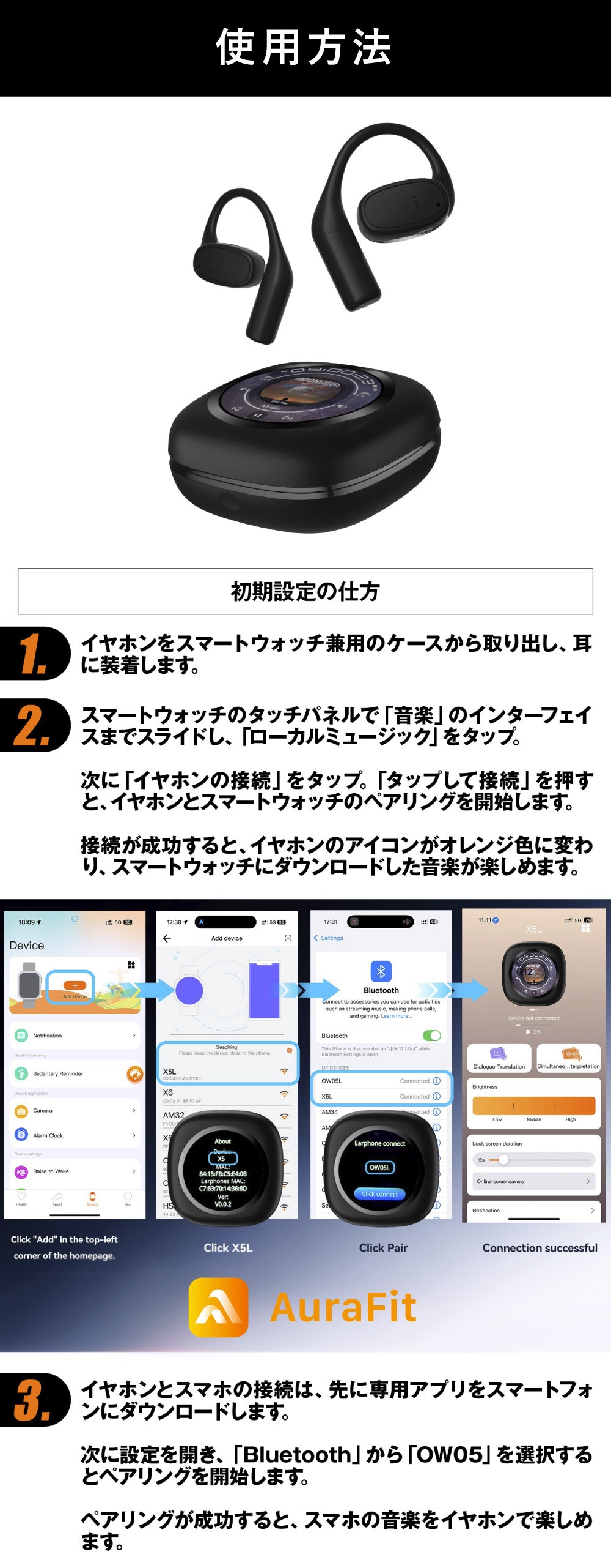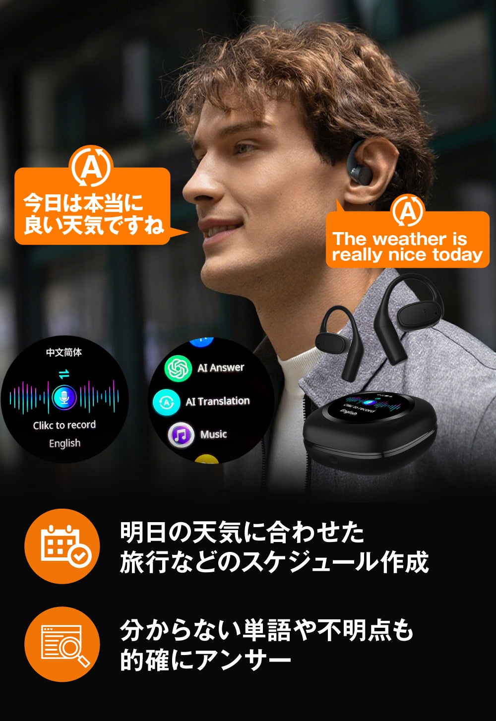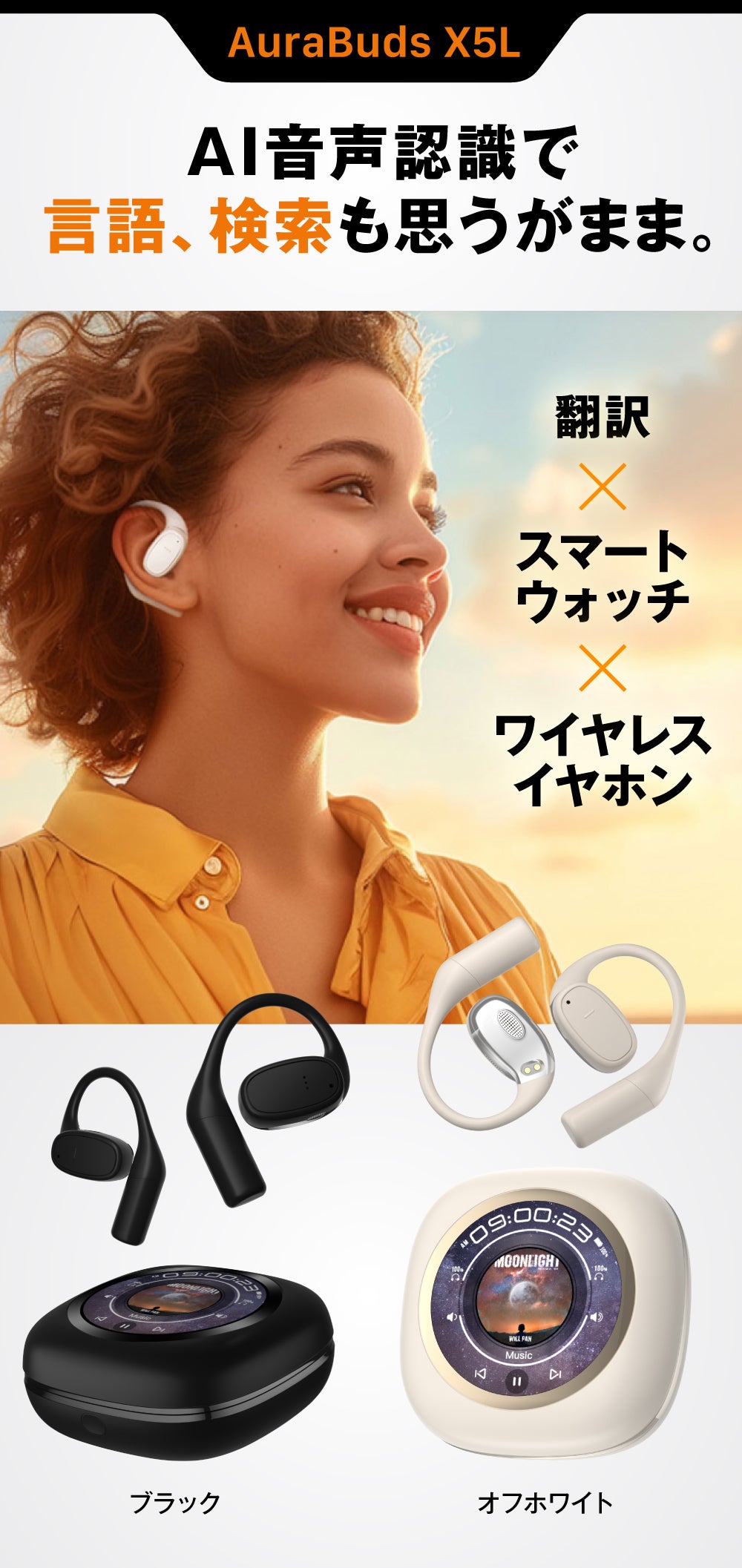 最新モデル AuraBuds X5L は、スマートウォッチと高音質ワイヤレスイヤフォンを一体化。AI翻訳や音声アシスタント、4GB音楽保存などを可能にし、旅行や語学学習、ビジネスまで幅広く活躍する次世代AIデバイスです。