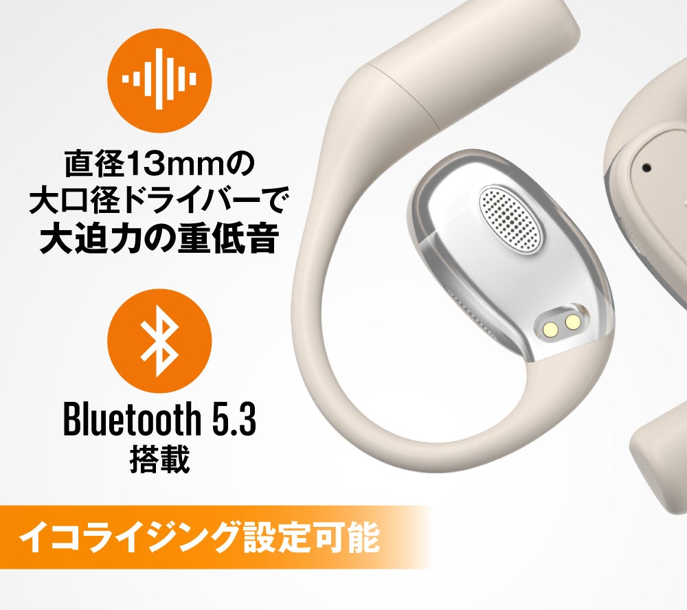 シリコン加工のフックを耳に被せて使うオープンイヤー型を採用しているので、耳への負担が少なく長時間の音楽鑑賞も快適。