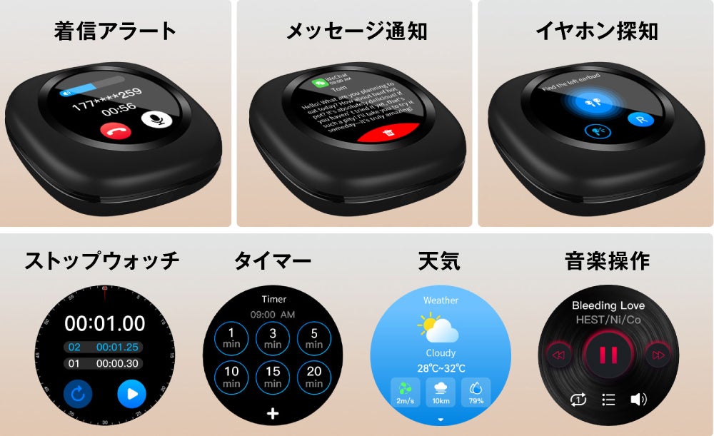 【AuraBuds X5L】のモニターには時計やアラームといった時計の機能以外に、天気予報やスマホの着信通知機能も搭載しています。