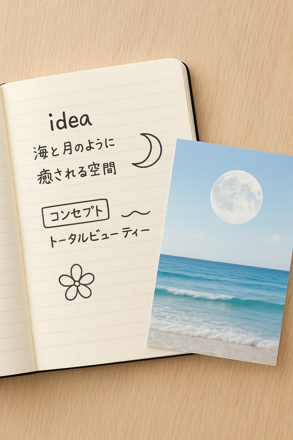 月と海をテーマにした静かな癒しのアートを添えて。