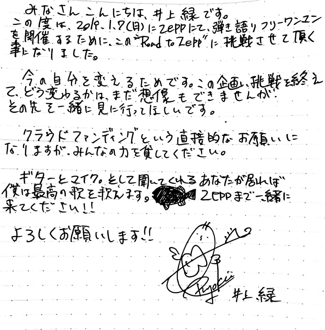2018/09/27 22:00 支援金額が100%を達成いたしました! 本当に本当にありがとうございます。 そして!総支援金額【105%】達成を記念してパトロン者全員に、Road to Zepp限定デザインの『バックステージパス風ステッカー』をお届けすることが決定いたしました! もっと見る【第三弾】井上緑からパトロン者の皆様に向けたスペシャルムービー!vol.3
