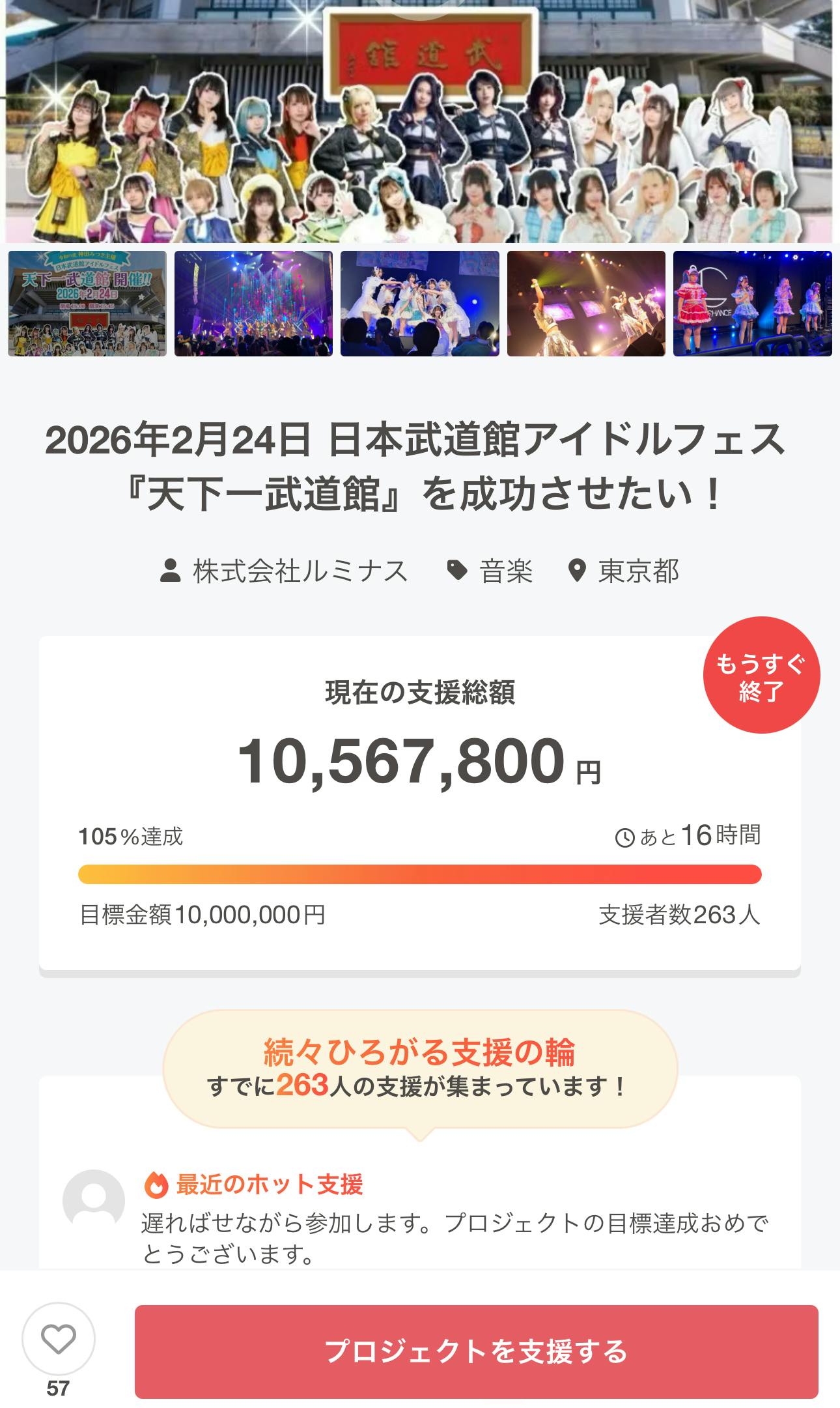 2026/01/10 08:00【目標金額達成しました!】2/24天下一武道館にむけたクラファン、皆様のおかげで目標金額の1,000万円を達成することができました!沢山の熱い応援、本当にありがとうございます!現在1,056万円•263名の皆様にご協力いただいています。おひとりおひとりの応援が、天下一武道館の成功につながっています。募集期間は、本日1/10 23:59までです。最後までぜひ応援よろしくお願いします! もっと見る