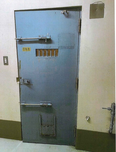 精神科病院の隔離室入り口。看護師がトイレの水を流すレバー(右)がある=2023年11月6日、宇都宮病院で撮影(西前啓子弁護士提供)
