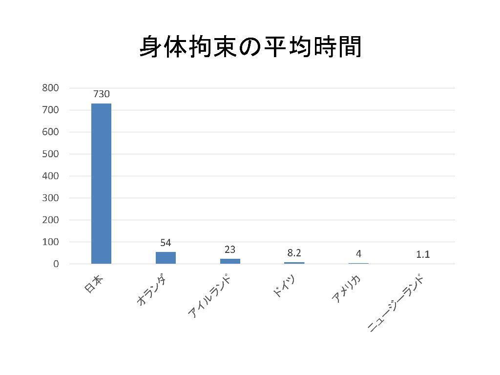 杏林大学の長谷川利夫教授らが行った調査研究によると、日本での身体拘束は人口10万人あたり120人、豪6人などと比べ極端に多い。入院患者1人に対する拘束の平均時間でも、日本は730時間、米4時間などと比べ突出して長い。