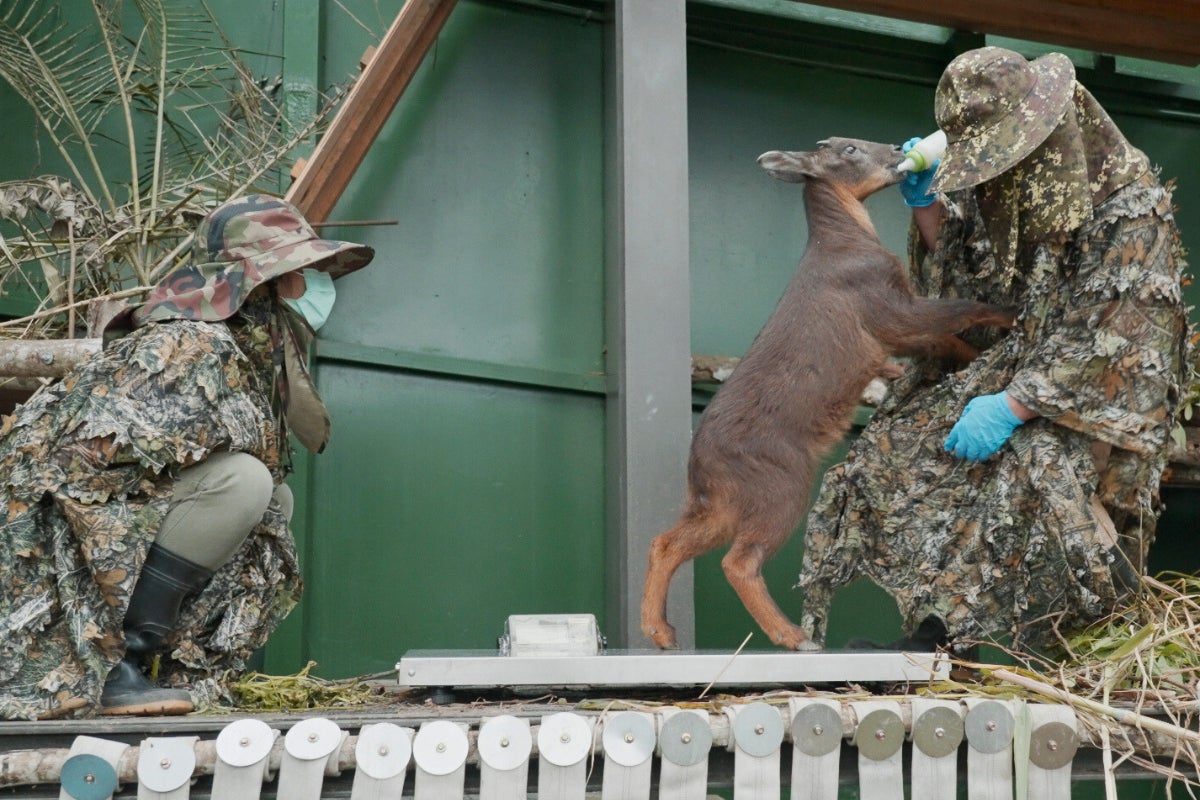 野生に戻れるよう迷彩服を着てミルクを与えている