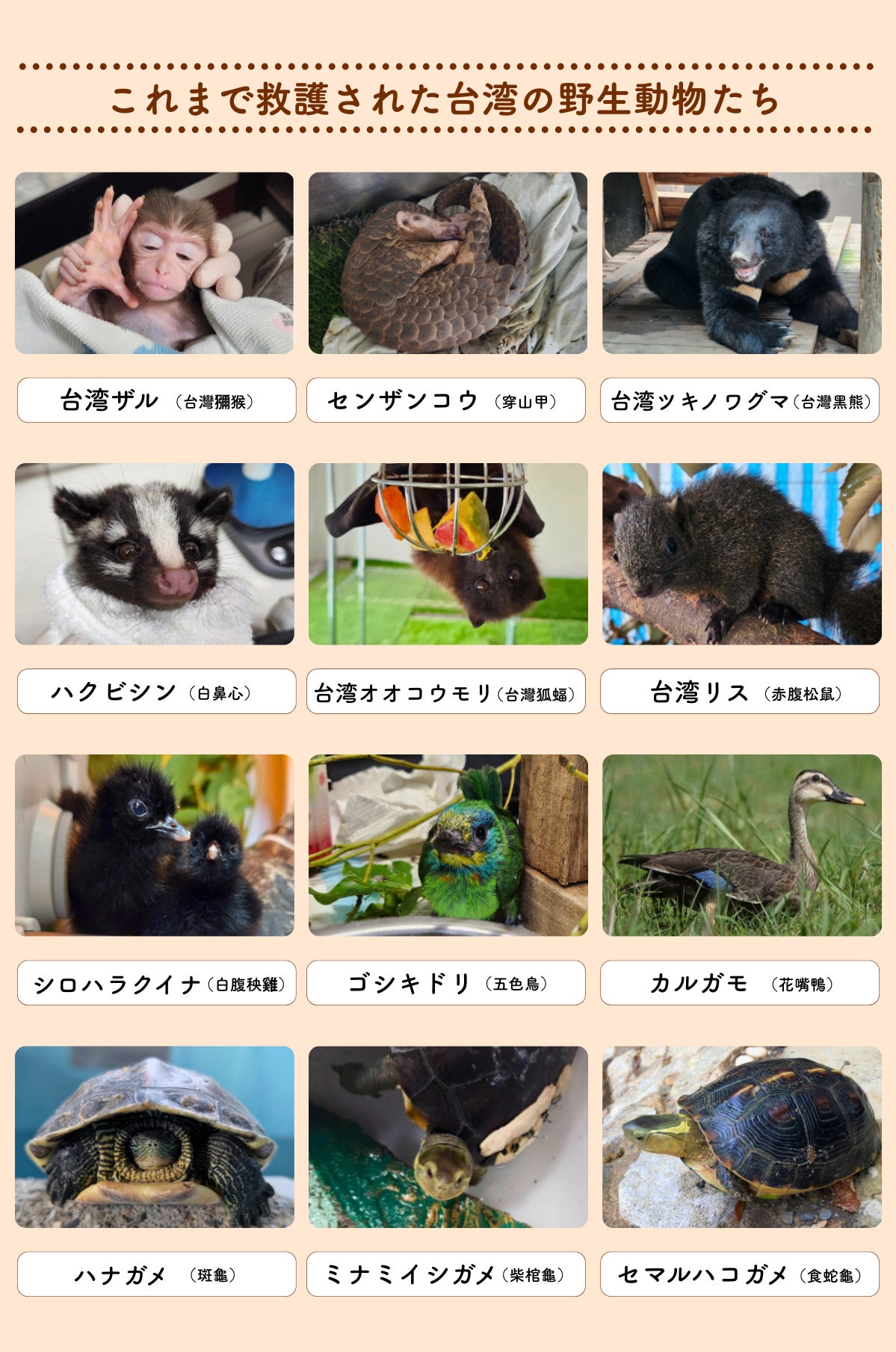 「野湾野生動物保育協会」では、これまで累計3,000(匹/頭)を超える救護を行ってきました。160種以上の台湾固有の野生動物が対象で、台湾ツキノワグマ、カンムリワシ、センザンコウ、ゴシキドリ、キバノロなど、保護種・一般種を問わず、救護を受け入れています。