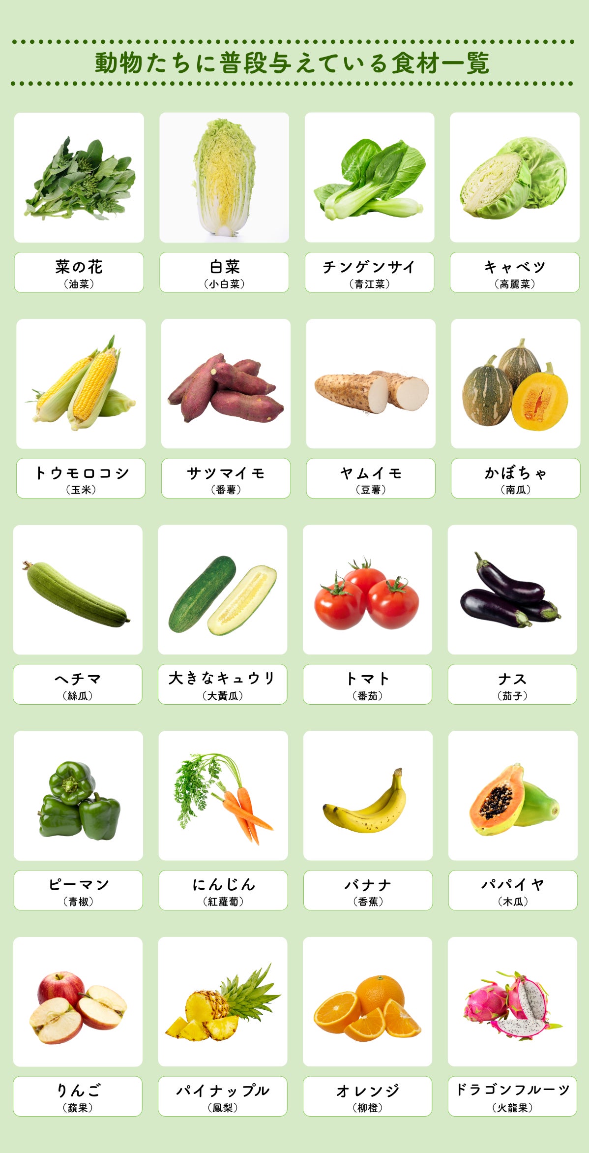 普段は、以下の野菜や果物を与えることが多いです。動物たちには、葉物野菜と根菜のどちらも必要です。原則として、特定の種類に固定せず、動物が好まない野菜の場合でも、少量ずつ交互に与えています。