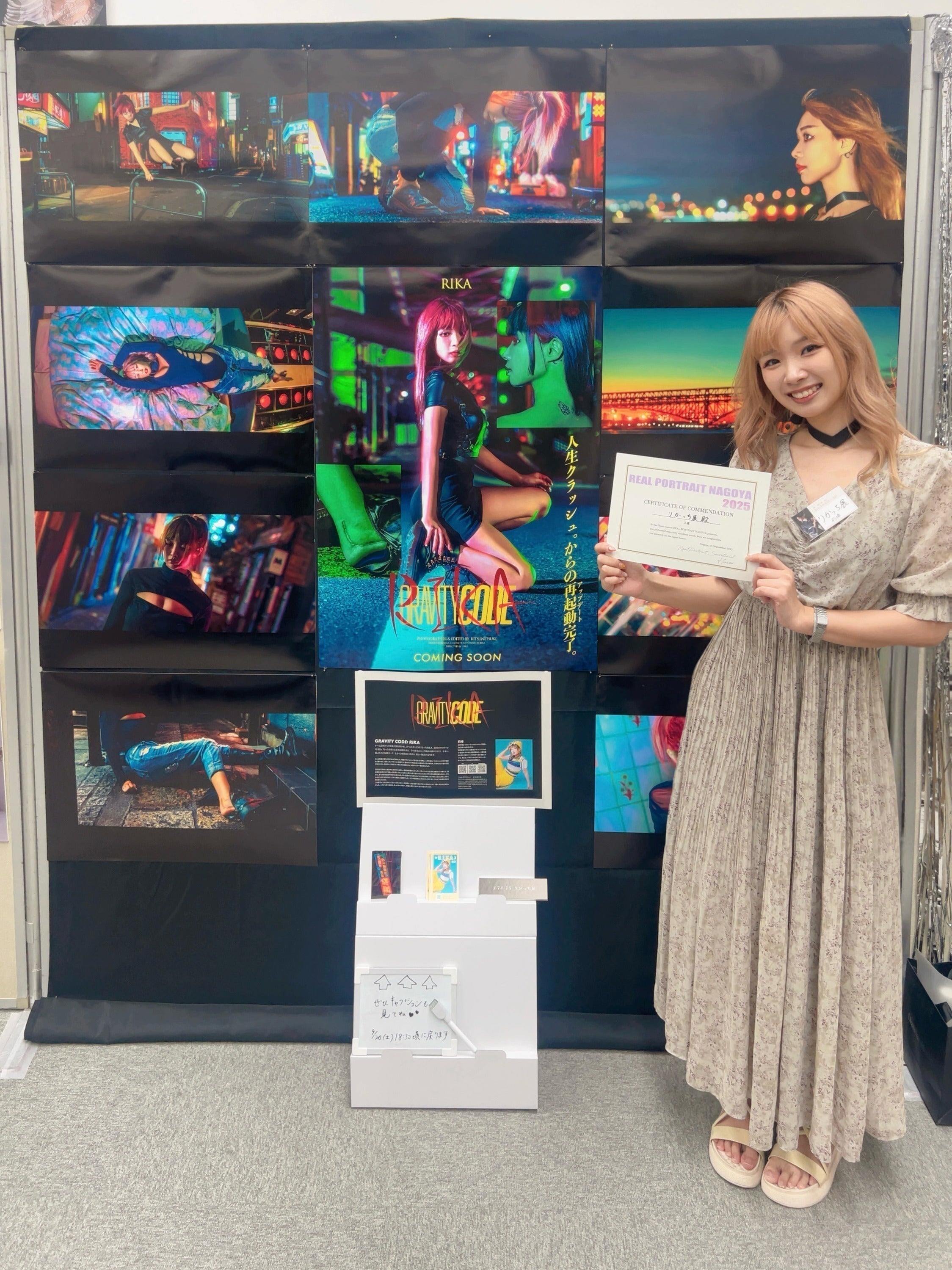 2025年9月に開催された日本最大のポートレート展「リアポ名古屋2025」では、この作品の一部9枚とポスター1枚の計10枚で展示しました。展示では『怪我をしてから再び立ち上がるまでの物語』をサイバーパンクの世界観でアクション映画のように表現し、多くの方々から温かい反響をいただきました。