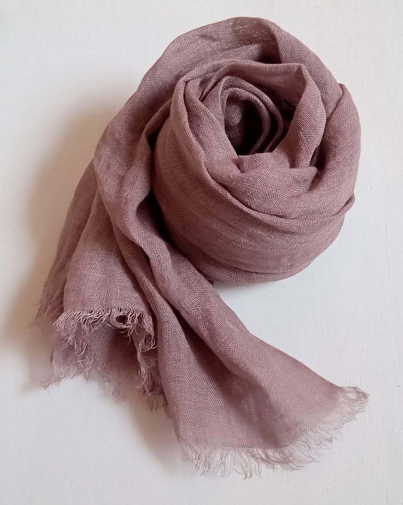 2. 職人の手仕事による「一点もの」化学染料では決して出せない、天然素材ならではの絶妙なムラ感や色の重なりがあります。リネンのストールやハンカチは、使うほどに肌に馴染み、風合いが増していく「育てる楽しみ」も魅力です。