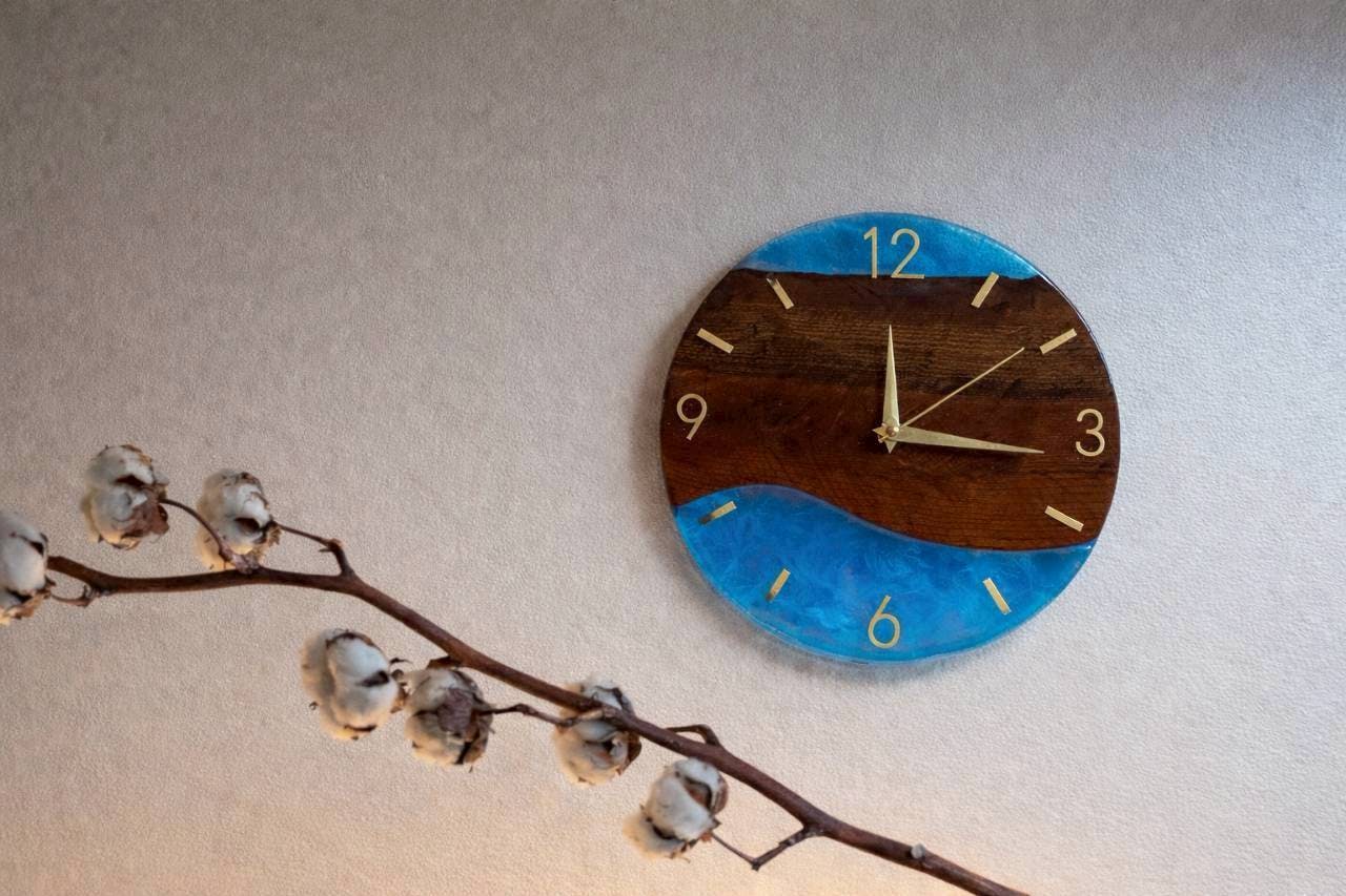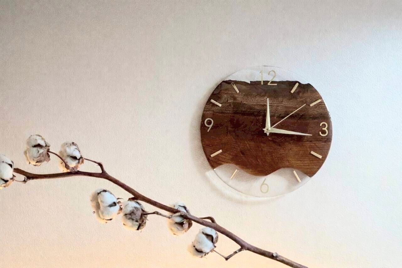 この時計は、ケヤキと鮮やかな「レジン」を組み合わせていますが、実はムーブメント(時計の機械ボックス)の配置にこだわりがあります。