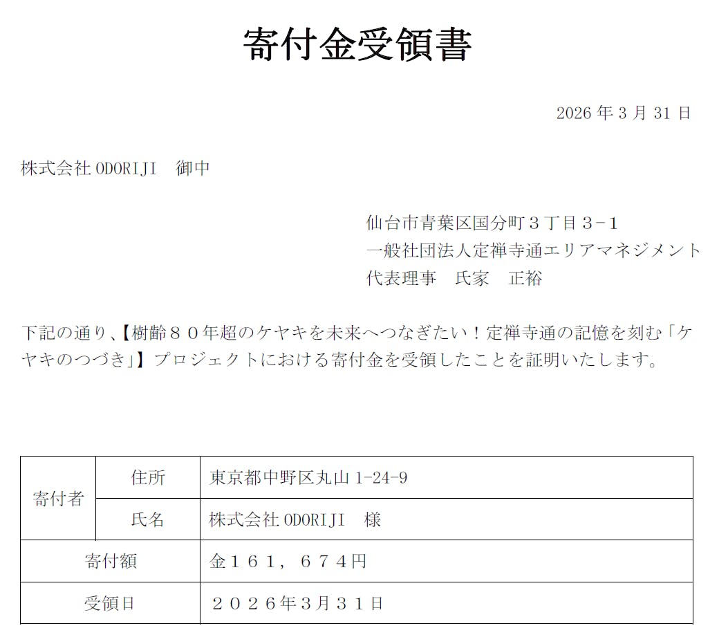 皆様からいただいた大切なご支援の中から、2026年3月31日付で「一般社団法人定禅寺通エリアマネジメント」様へ寄付を実施いたしました。