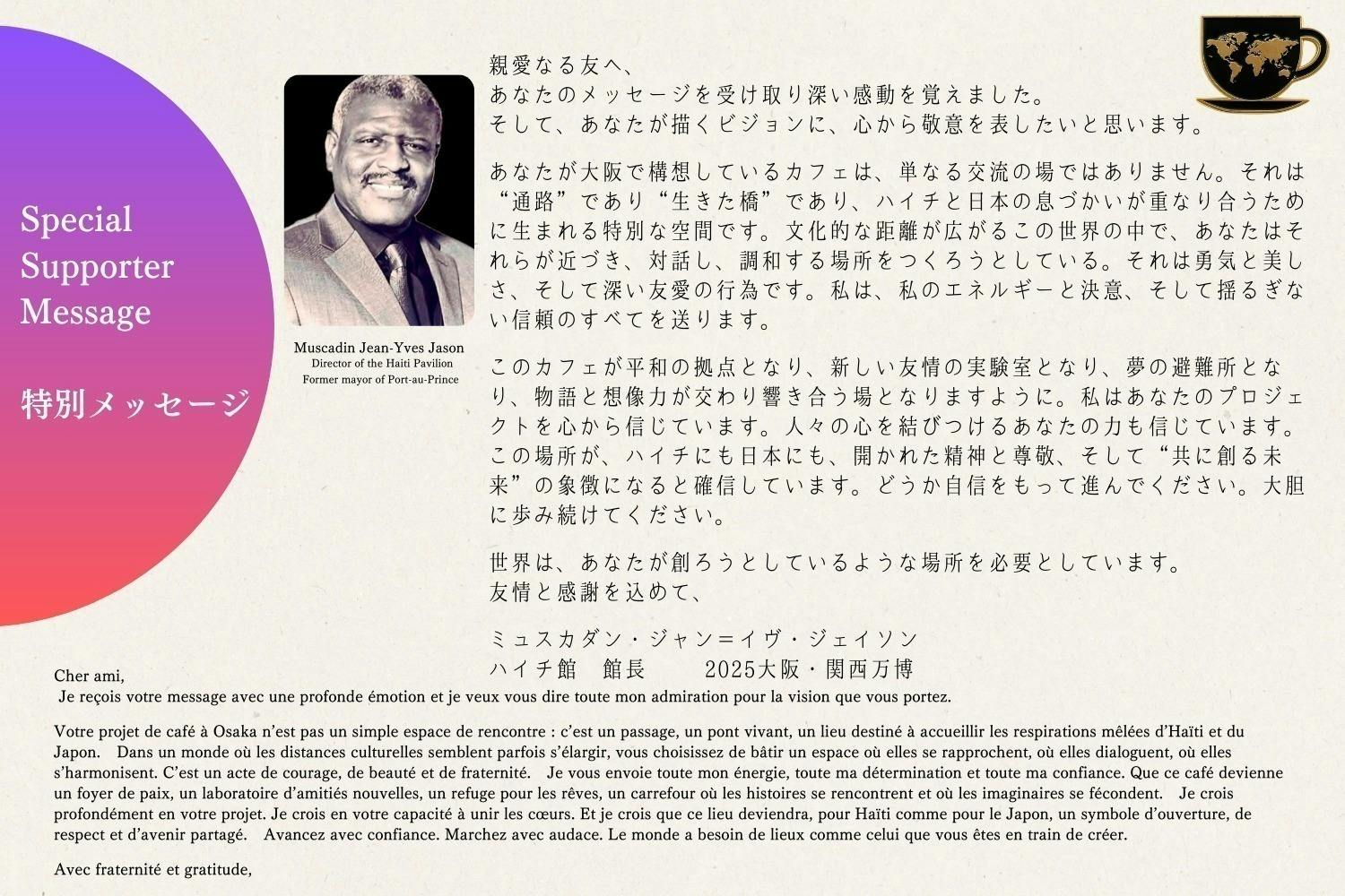 *本プロジェクトを利用して、プロジェクトオーナーと第三者(支援者を含む)との間の雇用関係を成立させることはございません。 また、プロジェクトオーナー以外の第三者(支援者を含む)が当事者となる雇用関係の成立をあっせんすることもございません。このことは、本プロジェクトのリターンについても同様です。*万博協会との関係は一切ございません。