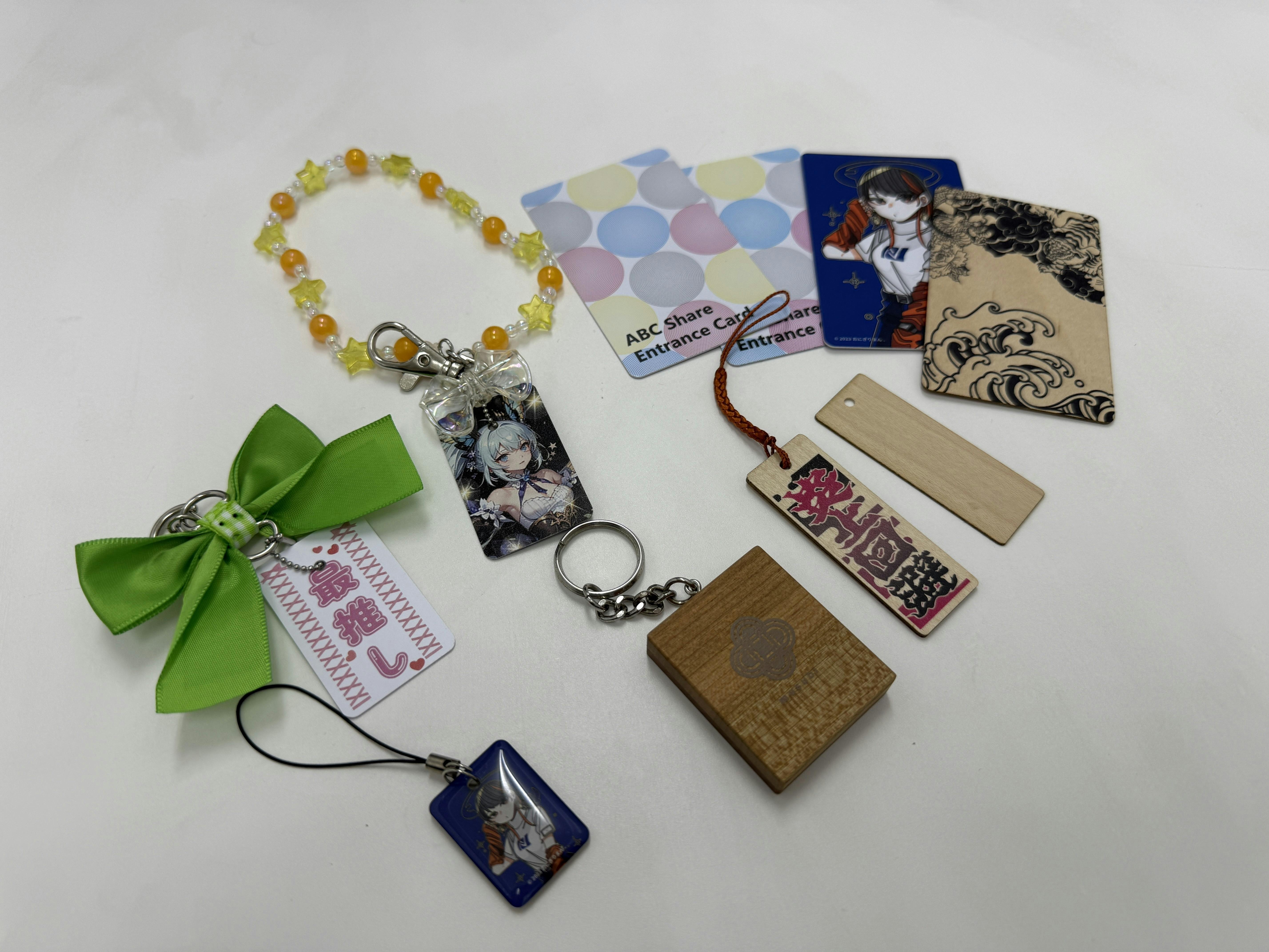 ストラップ、キーホルダー、木製カード・しおり、キャラクターカード、ビーズチャーム……普段の推し活でよく見るグッズばかり。
