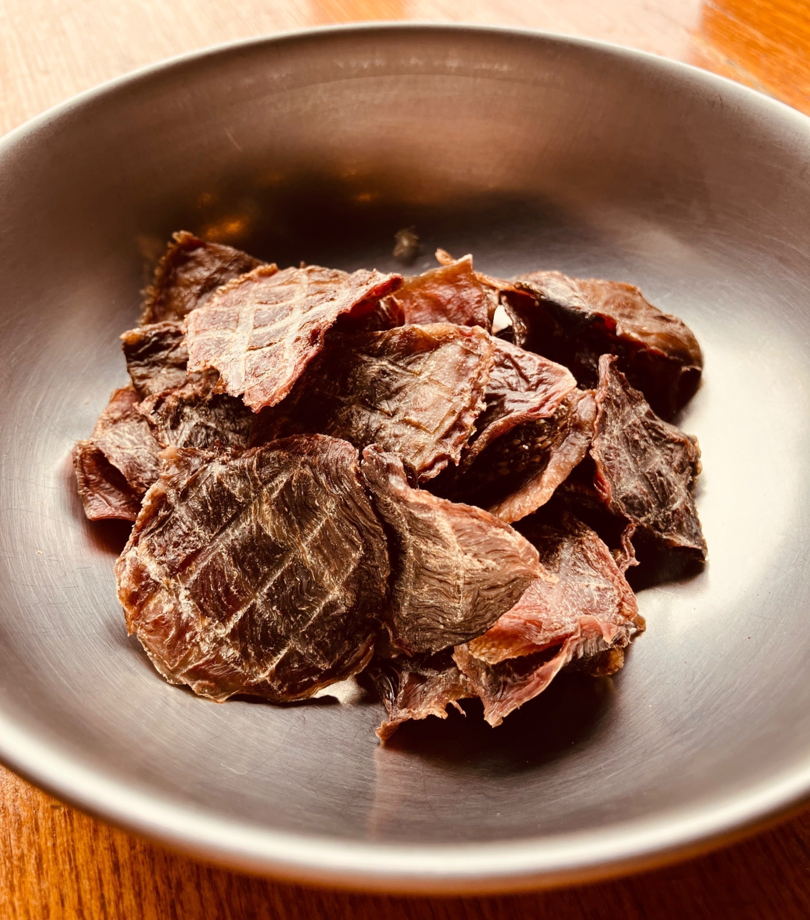 その第一歩が、廃棄されていた牛タンの皮を使った愛犬・愛猫のための保存料・着色料・香料など添加物不使用のジャーキーづくり です。