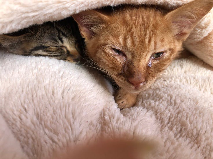 同じように鼻水や涙でつらそうにしている姿から、「猫風邪のうつりやすさ」が伝わります。