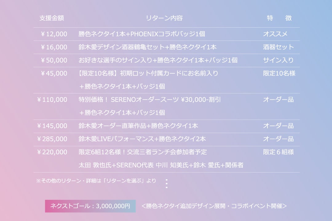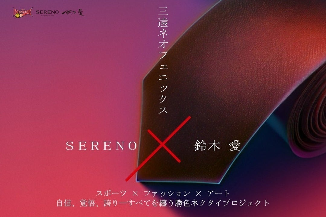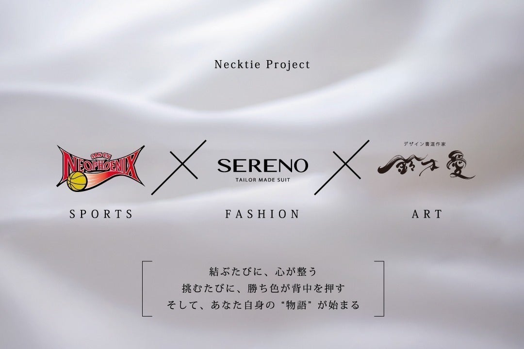 私たちは、ただのネクタイをつくるのではありません。それは、自信、覚悟、誇り―そのすべてを纏い「戦うためのギア」です。新しい年の始まりにふさわしい一本を。スポーツ(三遠ネオフェニックス)× ファッション(オーダースーツ専門店 SERENO)× アート(デザイン書道家 鈴木愛)。これまでにない三位一体のコラボレーションです。この三者が力を結集し、男女共に『ネクタイ』の概念を越えたアイテムとして「挑戦する人を後押しするネクタイ」を創造します。