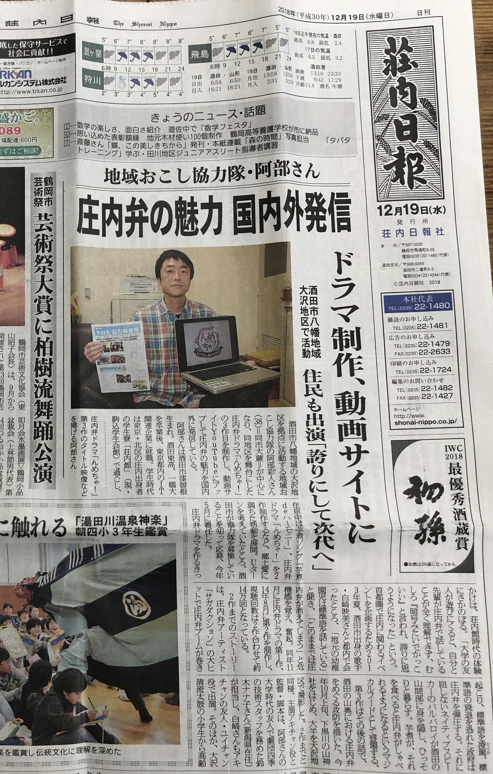 公開開始後、地元メディア様より取材もいただきまして、冒頭の画像のように12月19日の荘内日報では1面トップで記事掲載いただきました。