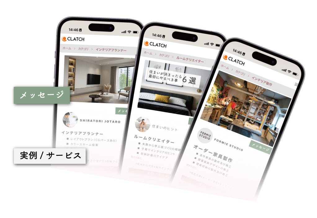 同じ職種のプロによっても得意分野が違います。それぞれの仕事の解像度をあげ、必要に応じてどの人とのマッチングがベストかをサポートするのがCLATCH【クラッチ】です!!家具購入までもフォローいたします。