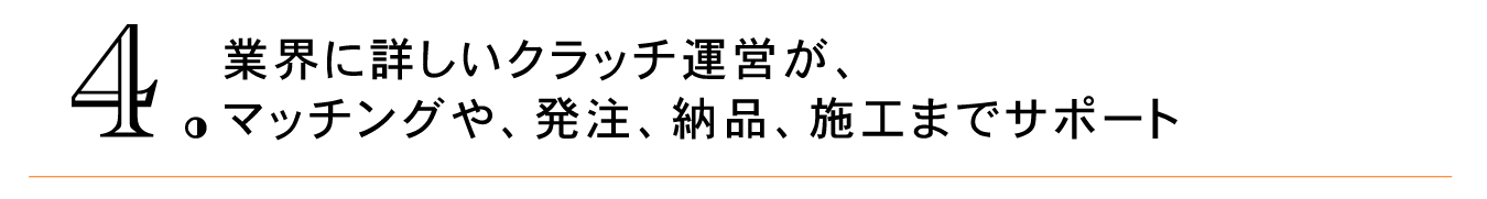 ❹ 業界に詳しいクラッチ運営が、マッチングや、発注、納品、施工までサポート