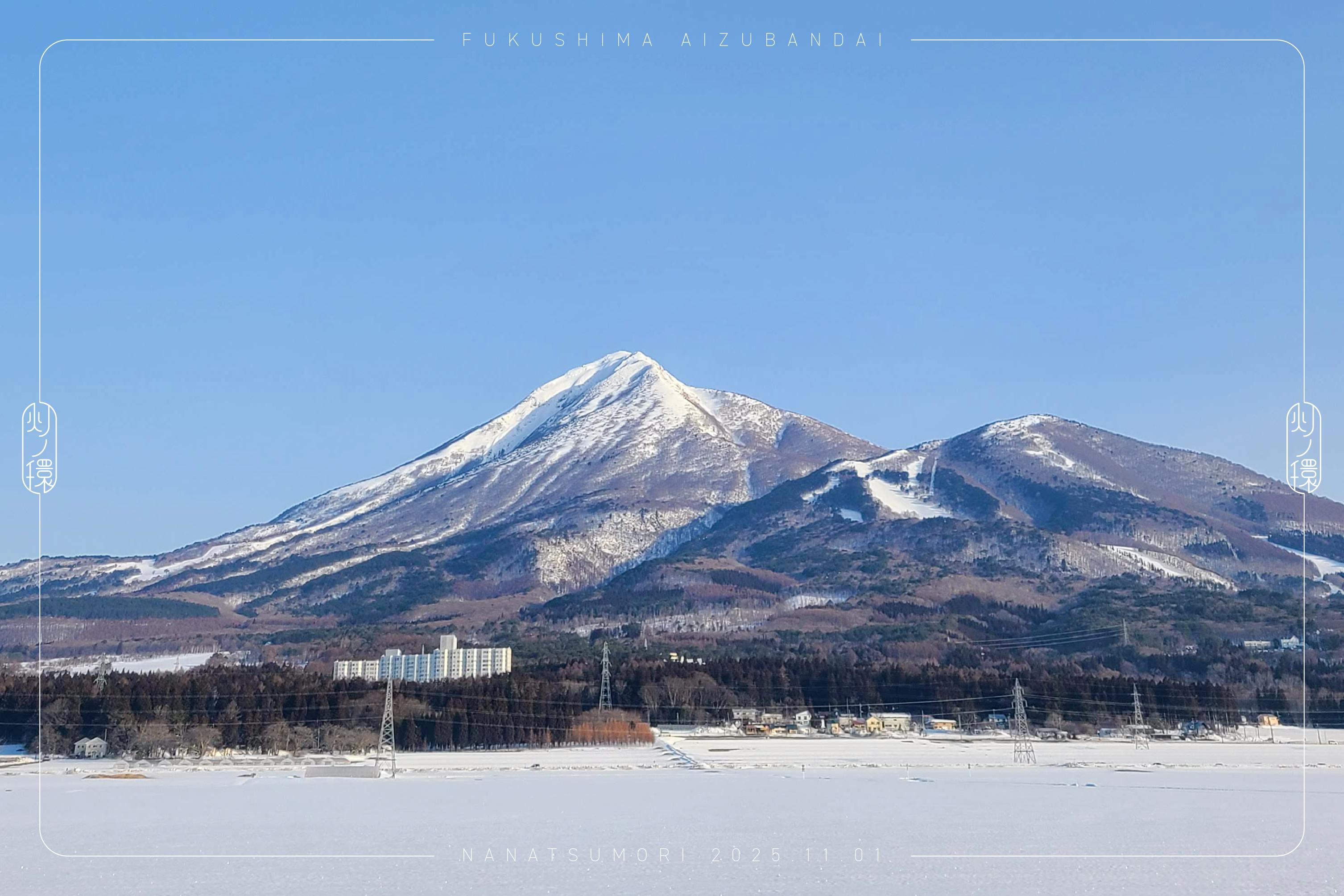 <1月頃の磐梯山。一面が雪景色に覆われ、季節の移り変わりやアクティビティを。>
