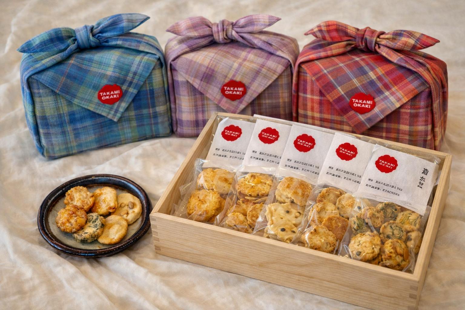 風呂敷のデザインは、TAKAMIOKAKIの雰囲気に合う落ち着いた色合いと柄を選び、オリジナルタグまたは刺繍を付けて仕上げます。地元の工房と協力して、おかきと播州織、両方の良さを引き立てる特別なコラボレーションを実現します。
