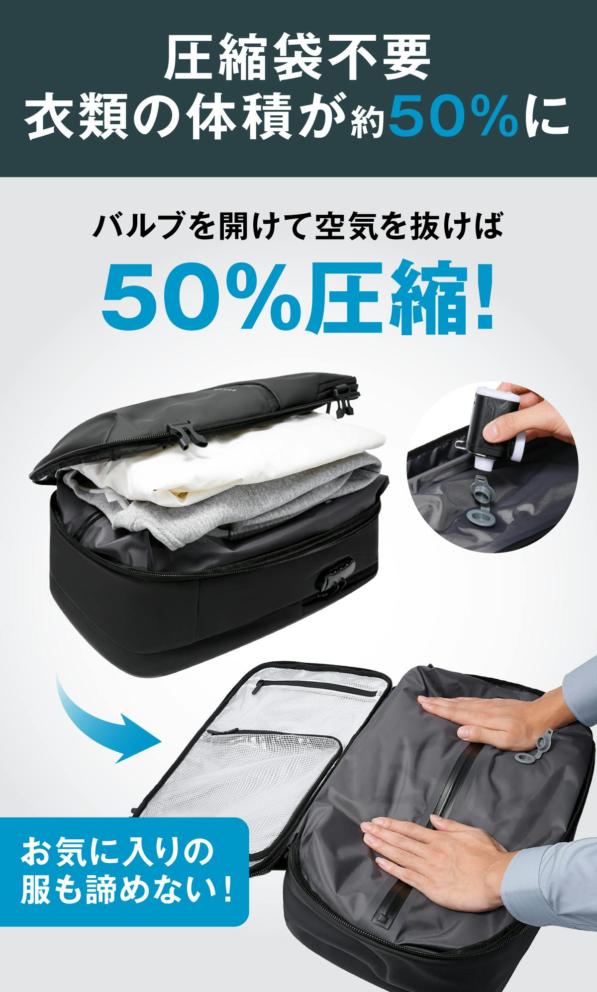 2026/02/23 14:08ご覧いただきありがとうございます。BANGE AIR プロジェクトチームです。本プロジェクトは、いよいよ今月末までとなりました。公開からここまで、多くの方にページをご覧いただいています。改めて、本製品の特長を整理いたします。・衣類を最大約50%圧縮できるバキューム機能・電動ポンプ付属(空気の出し入れ両対応)・普段使いもできるスマートなデザイン・防水ポケット、ダイヤルロック搭載出張や1〜2泊の旅行など、「スーツケースを持つほどではないが、荷物は多い」そのようなシーンを想定して設計しました。圧縮機能を備えながら、見た目はシンプルで日常にもなじむデザインです。終盤ではありますが、最後まで本製品の魅力を丁寧にお伝えしてまいります。引き続き、BANGE AIRをよろしくお願いいたします。 もっと見る