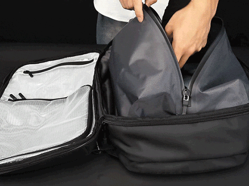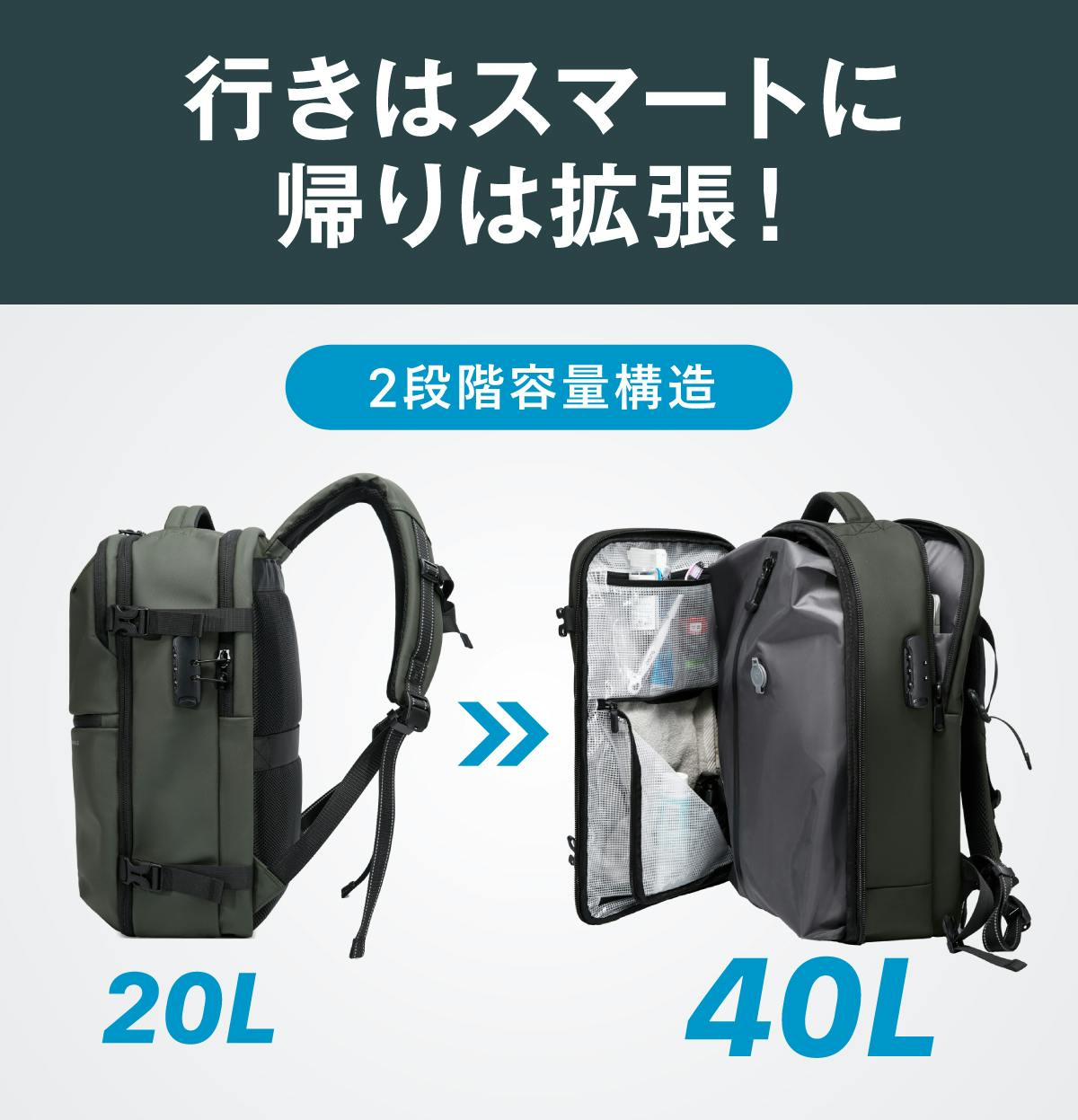 拡張すると、フーディ・着替え一式・ガジェット類・小物など、1〜2泊に必要な荷物が余裕をもって収納できます。