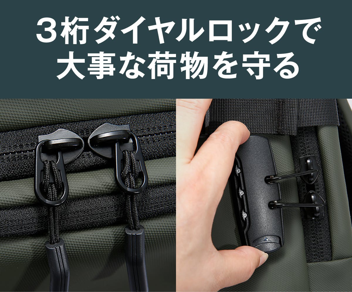 新幹線や飛行機で手荷物として持ち込む場合でも、荷物置き場に置く際にはしっかりダイヤルロックで安心!