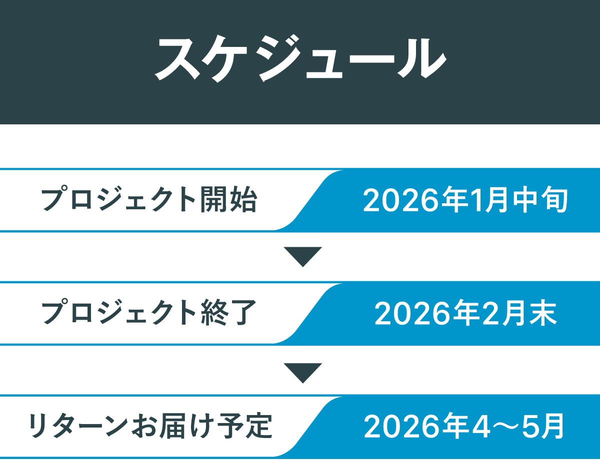 ●引渡し時期: 各リターン詳細に記載の発送予定月を引き渡し時期とします。但し、開発・生産状況によって遅れが生じる場合がありますのでその際は当プロジェクトページ内の「活動報告」または購入者へのメール等で連絡します。