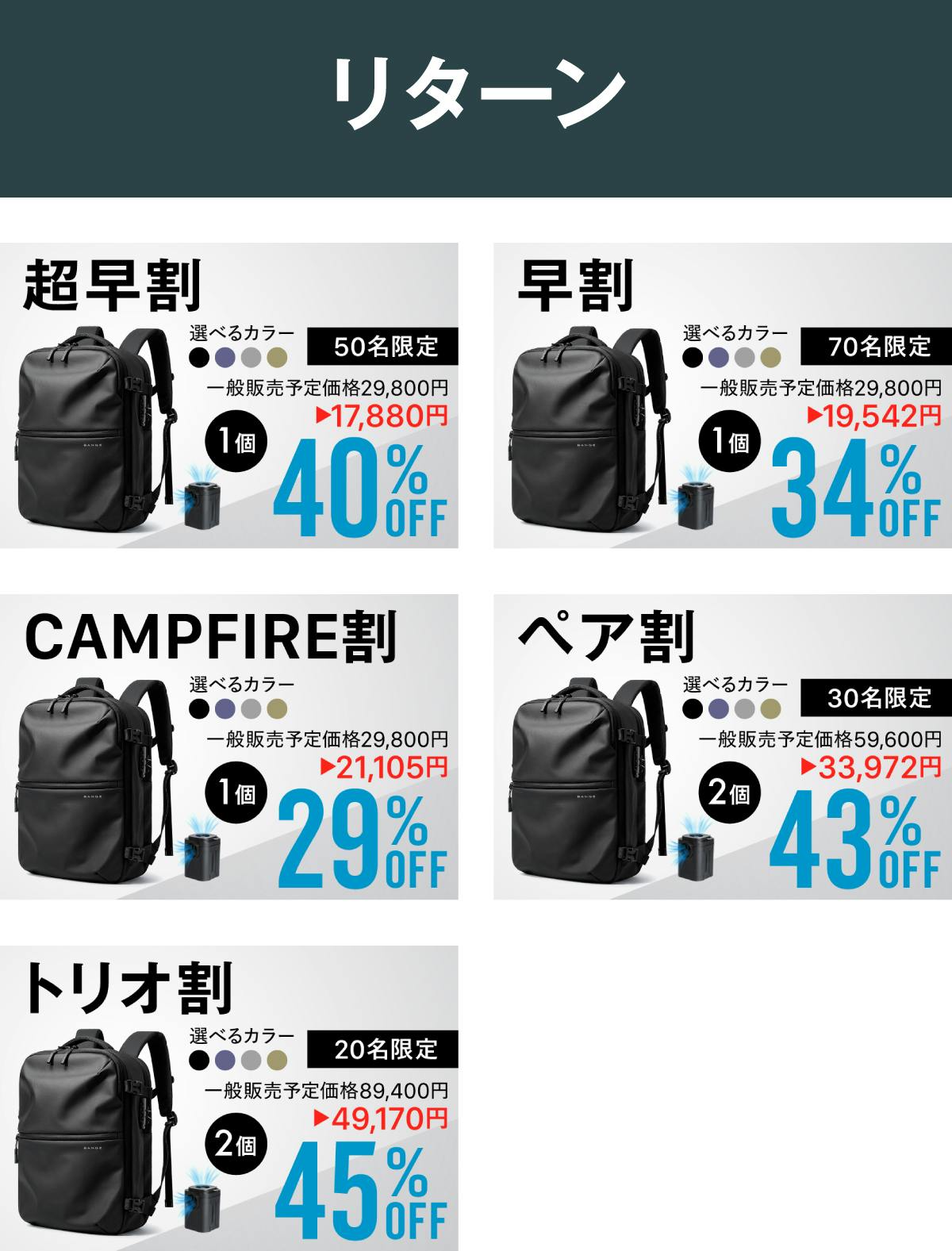 2026/02/28 07:12ご覧いただきありがとうございます。BANGE AIR プロジェクトチームです(^^)本プロジェクトは、本日が最終日となりました。ここまでご覧いただいた皆さま、応援してくださった皆さま、本当にありがとうございます。改めて、BANGE AIRの特長を整理します。・衣類を最大約50%圧縮できるバキューム機能・電動ポンプ付属(空気の出し入れ両対応)・普段使いもできるスマートなデザイン・防水ポケット、ダイヤルロック搭載・どれも使いやすい4カラー展開・日常から、出張や1〜2泊旅行、「スーツケースを持つほどではないが、荷物は多い」そのような場面を想定し作られました!※現在、人気カラーは1位:ブラック2位:ネイビー3位:カーキグリーンとなっています。男女共にユニセックスで使えるオシャレなカラー展開です!ペア使いもオススメ!いよいよ本日終了となりますので、最後にもう一度ご検討いただけますと幸いです。引き続き、BANGE AIRをよろしくお願いいたします。 もっと見る