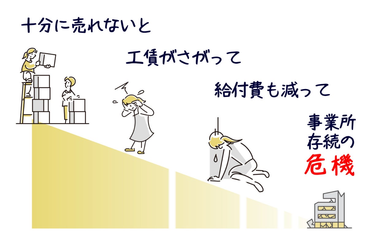 商品が十分に売れなければ、働く人の収入(工賃)が減ってしまう。工賃が下がると「事業の成果が低い」とみなされ、支援に必要な給付費も減ってしまう。そして、いずれは事業所自体が立ち行かなくなってしまう──。